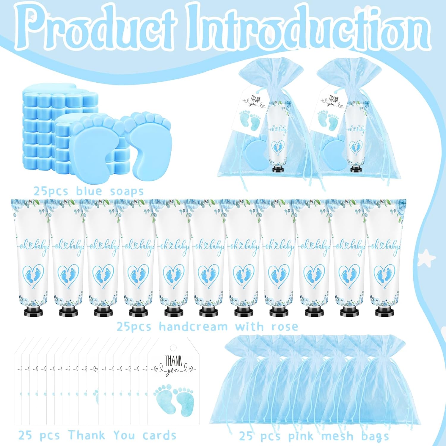 25 Sets Baby Shower Favors for Guests Hand Cream Baby Feet Scented Soap Party Favors Blue Baby Shower Guests Gifts with Organza Bags and Thanks Tags for Baby Shower Wedding Party