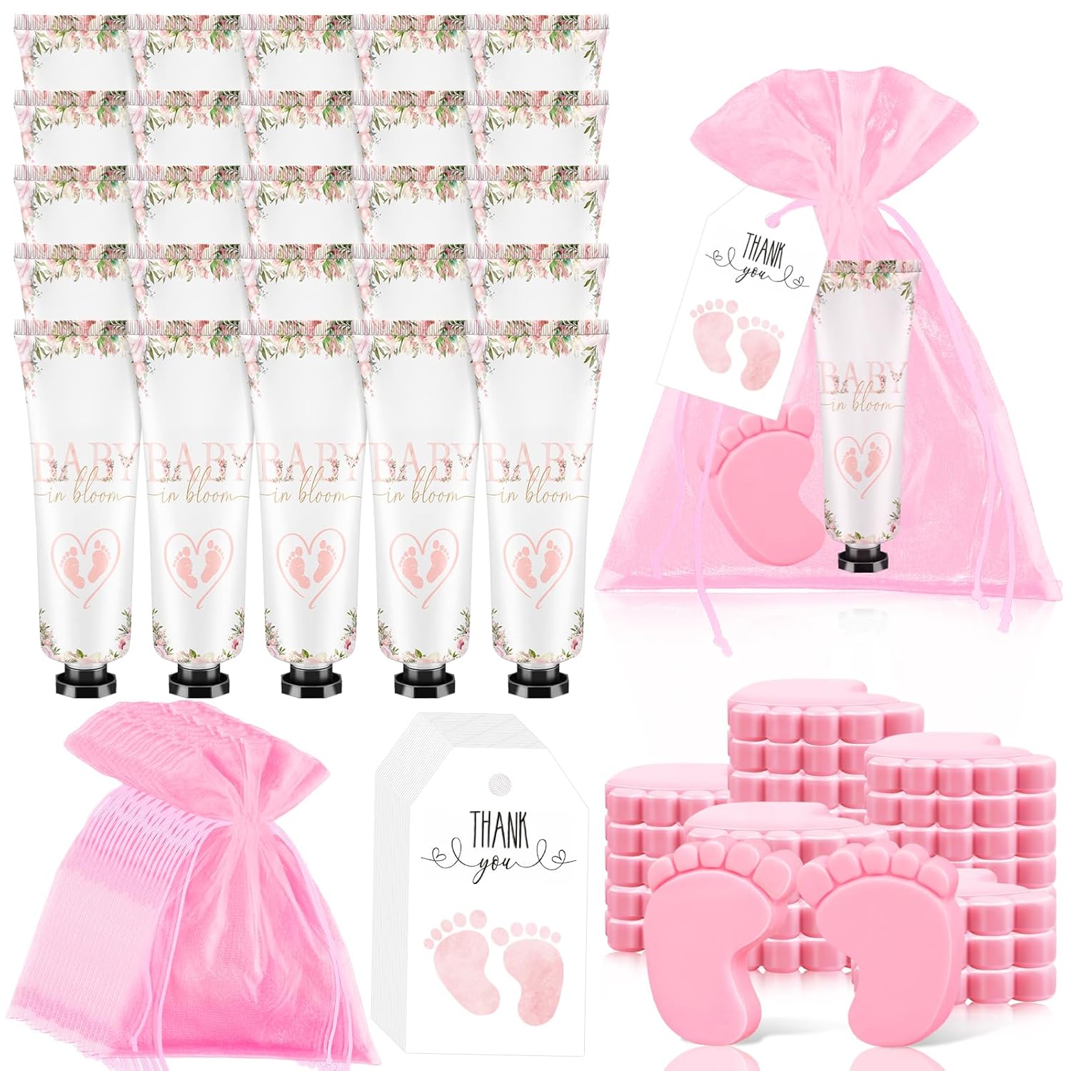 - Product Include: This set offers 25 sets of baby shower favors; It includes 25 pcs hand cream, 25 pcs scented soap, 25 pcs thank - you tags, and 25 pcs organza bags; The sufficient quantity can cater to your needs for various occasions such as baby showers, parties, wedding, birthday gifts or simply for home use