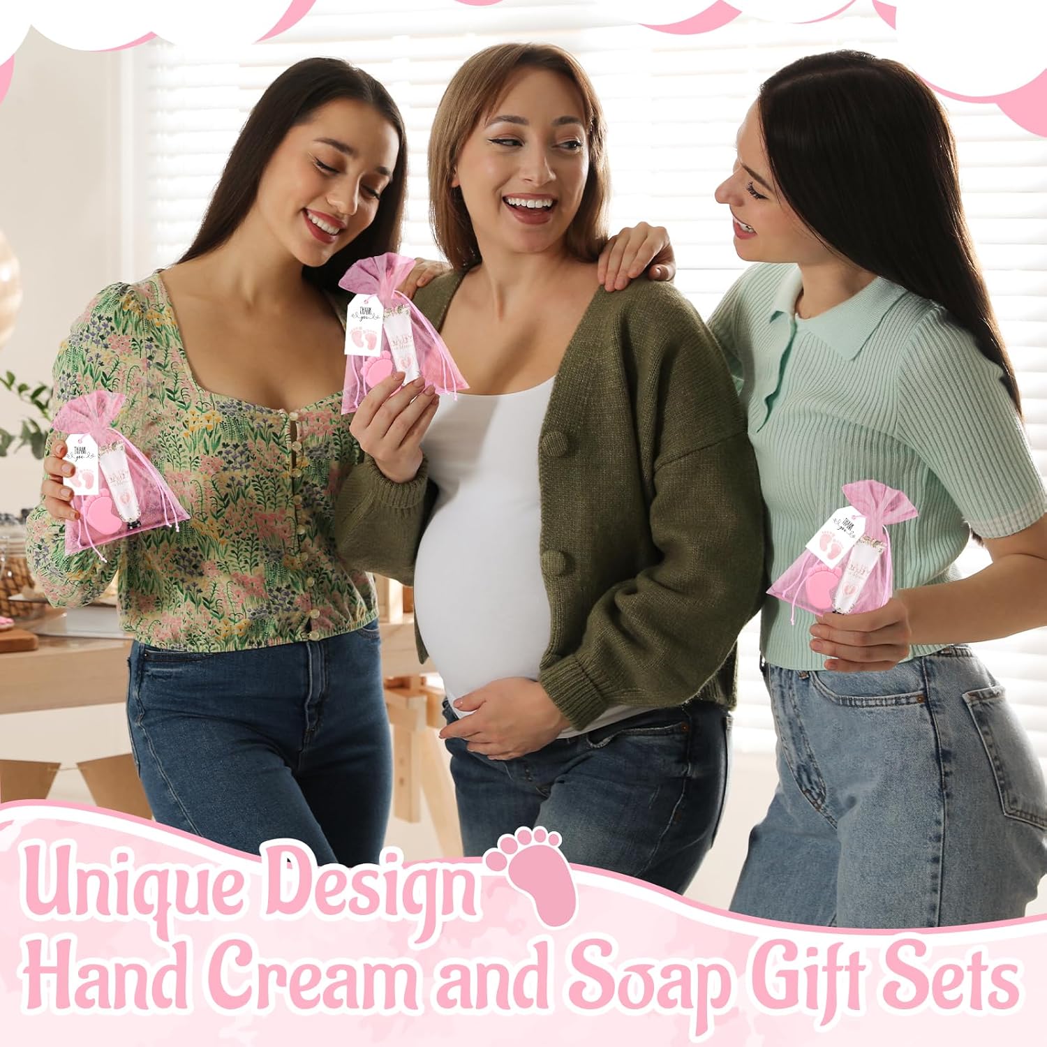 25 Sets Baby Shower Favors for Guests Hand Cream Baby Feet Scented Soap Party Favors Pink Baby Shower Guests Gifts with Organza Bags and Thanks Tags for Baby Shower Wedding Party