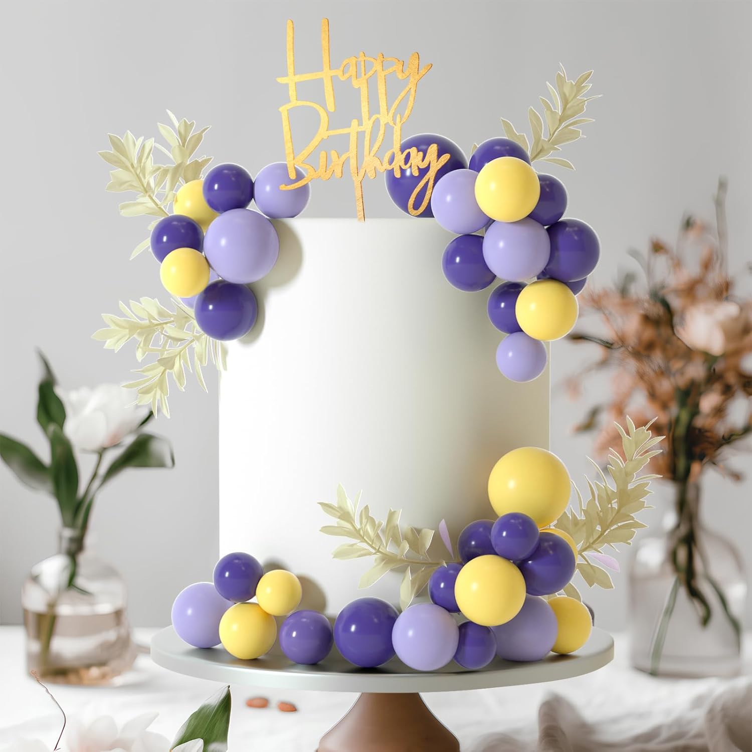 - Package included : 10pcs white grass cake toppers, 1pc happy birthday cake topper,14pcs Purple balls,14pcs yellow balls,14pcs light purple balls