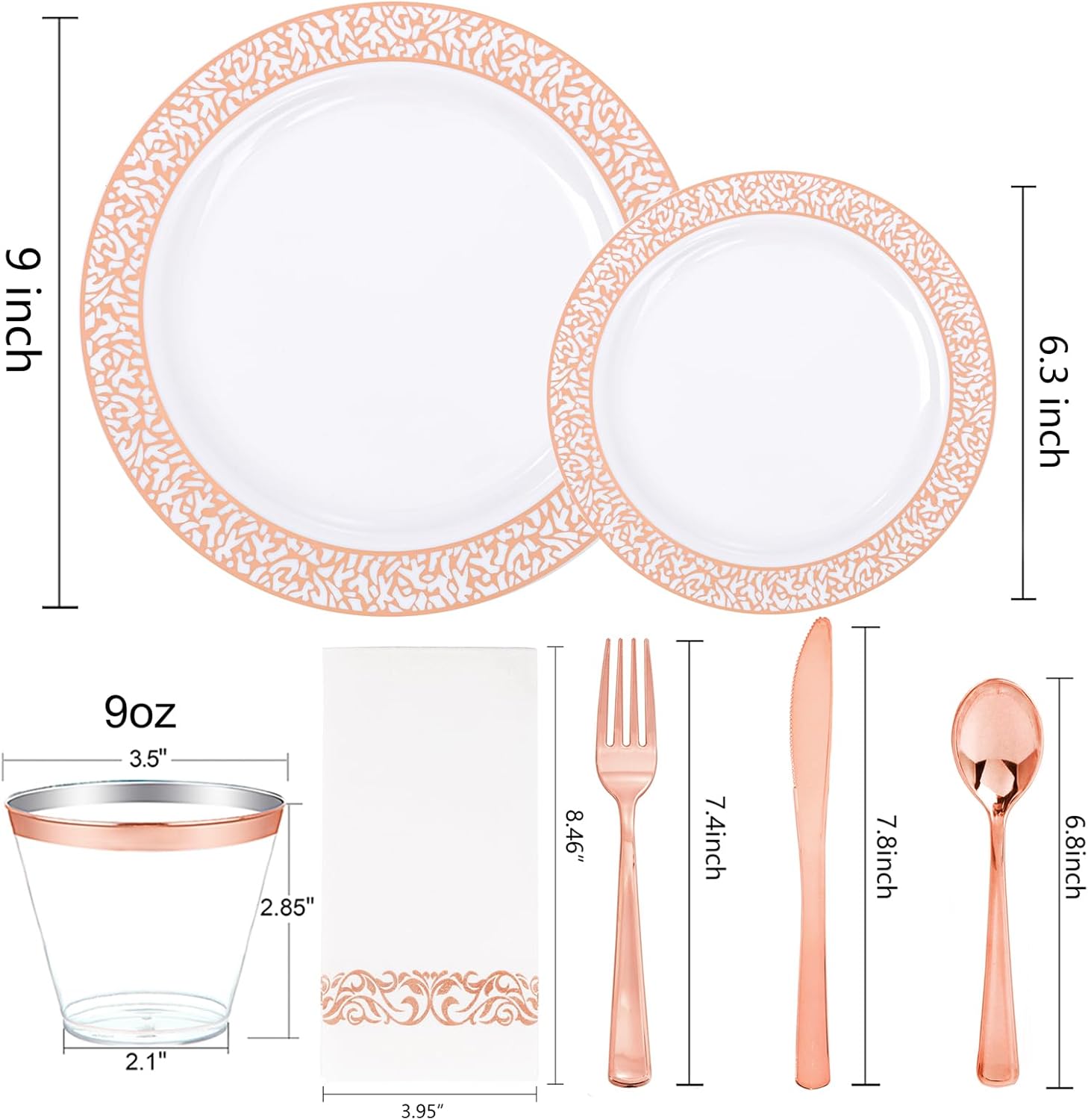 - SERVE FOR 50 GUESTS: Our plastic rose gold plates set for you to prepare 10.25 “&7.5” plates,and rose gold silverware ,In addition, a 9oz cup and lace printed tissues are also prepared for you, and this rose gold plates and napkins party supplies can fully meet the needs of your large party of 50 guests,