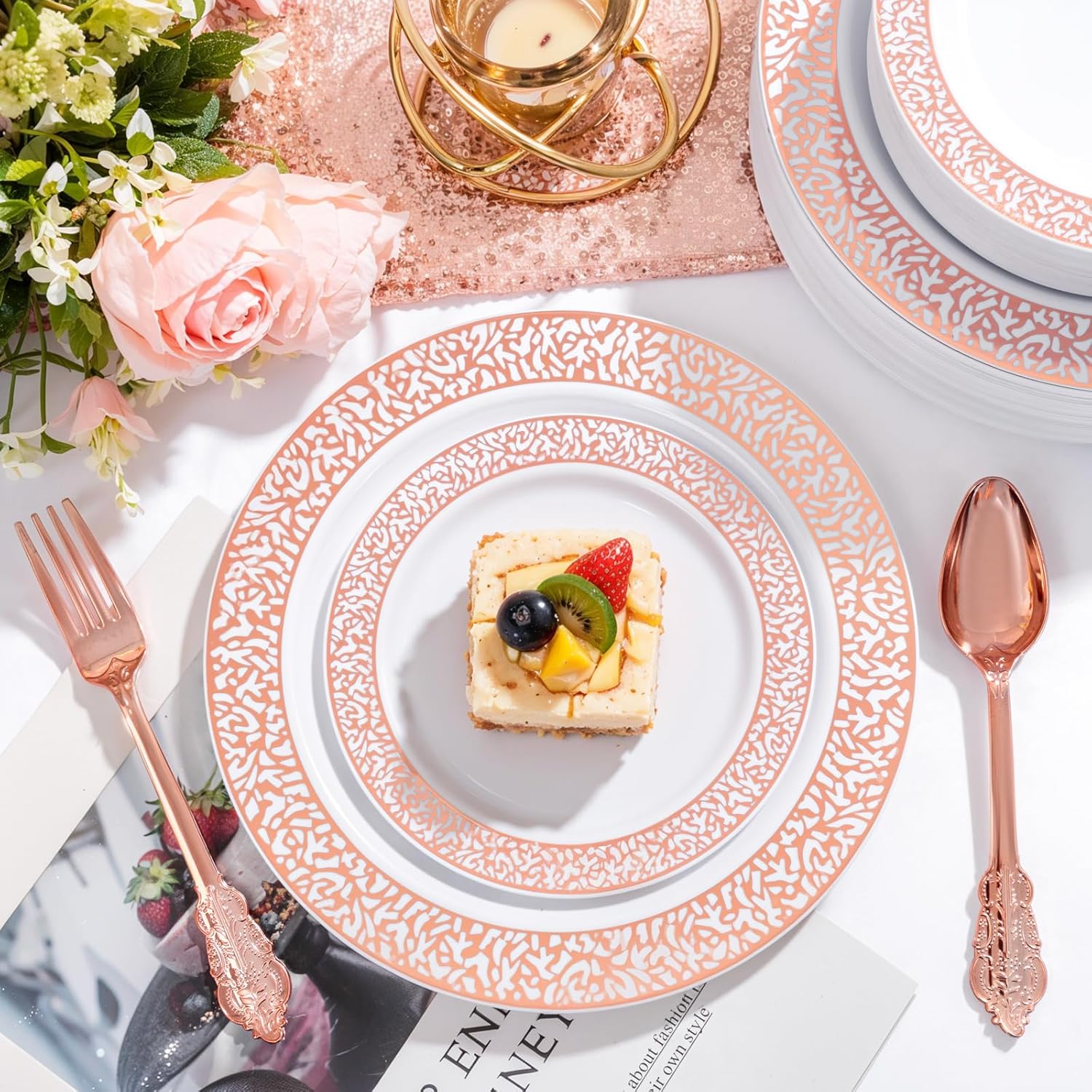 Festiva 350PCS Rose Gold Plastic Dinnerware Set - Disposable Lace Rose Gold Plates and Napkins Party Supplies - include plates,napkins,cups,silverware - Serve for 50 Guests Party&Wedding&Mother's Day