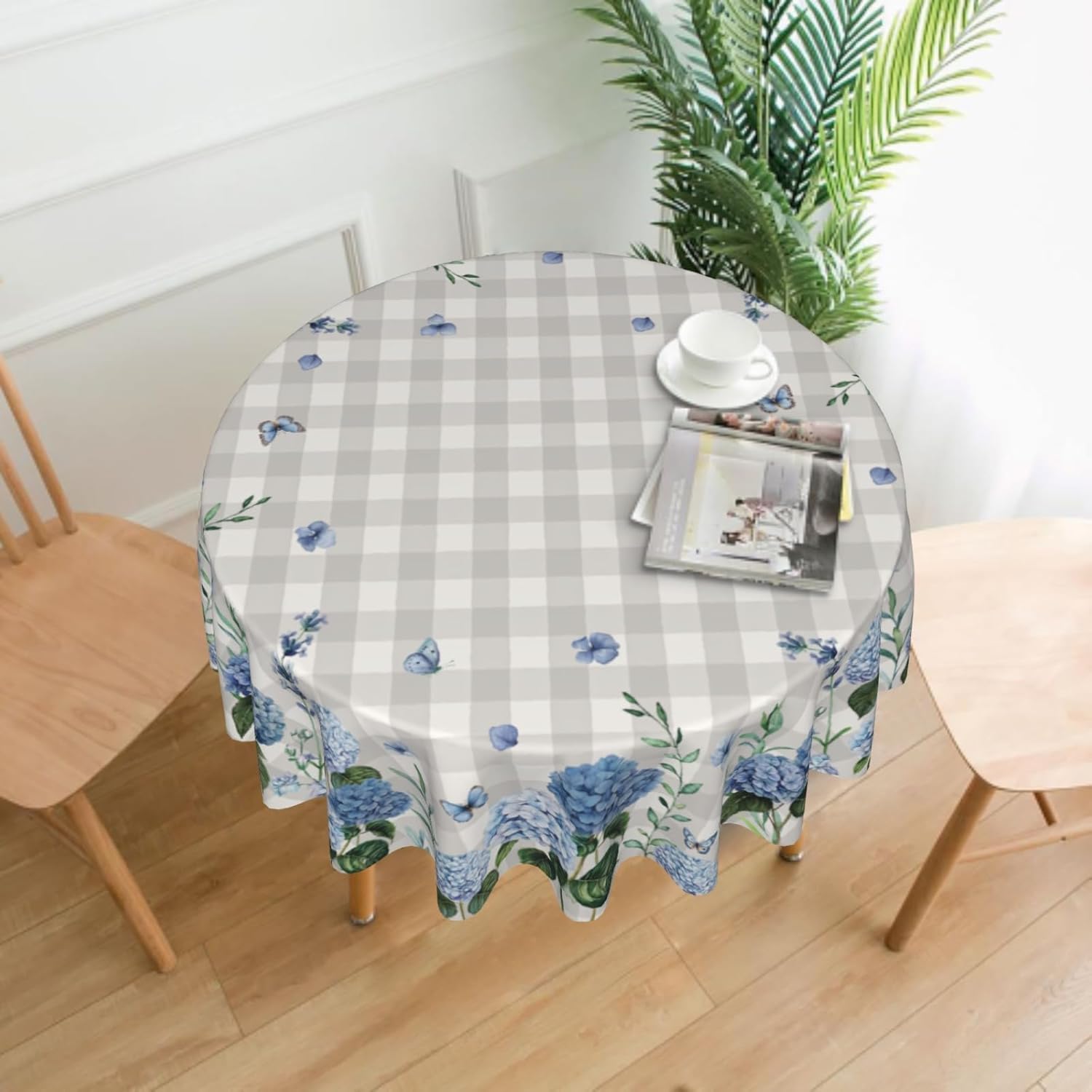Giwawa Spring Summer Round Tablecloth 60in Watercolor Blue Hydrangea Floral Butterfly Table Cover Grey Buffalo Plaids Washable Table Cloth for Dining Kitchen Picnic Indoor Outdoor Decor