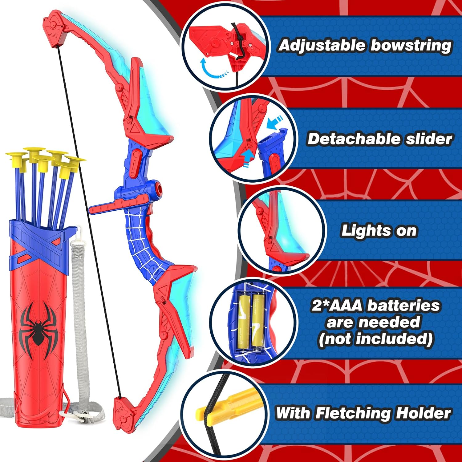 - Start Aiming & Firing Right Away: This bow and arrow set comes with a detachable target stand, a light up web bow, spider quiver, and 7 suction cup arrows. Cool bow and arrow toy for boys ages 4-7 8-12
