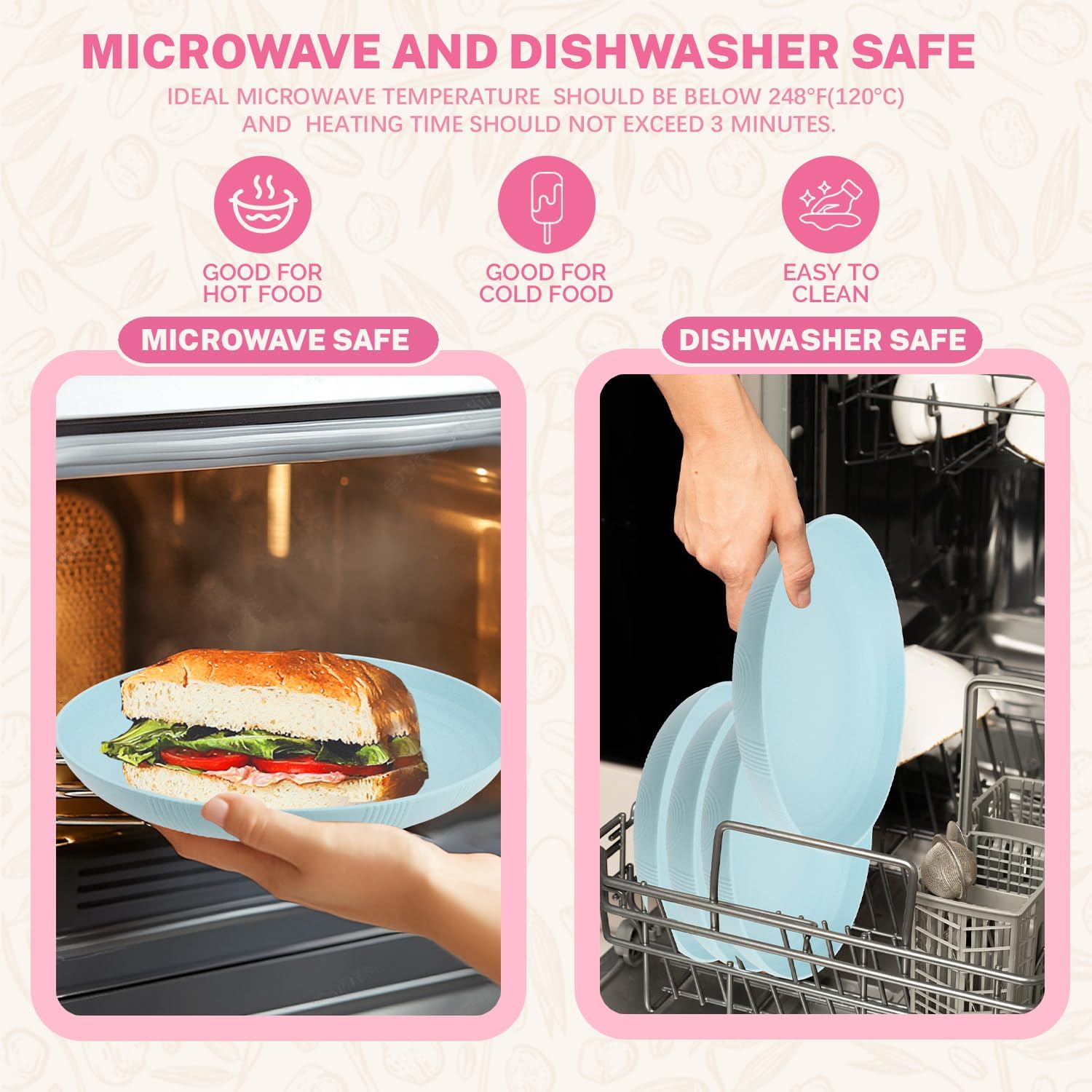 - DISHWASHER AND MICROWAVE SAFE: These microwavable plates are very easy to clean, you can wash them into your dishwasher. And they work great in microwaves without getting too hot.[ Note: The temperature resistance reaches up to 248 degrees Fahrenheit (120℃)]