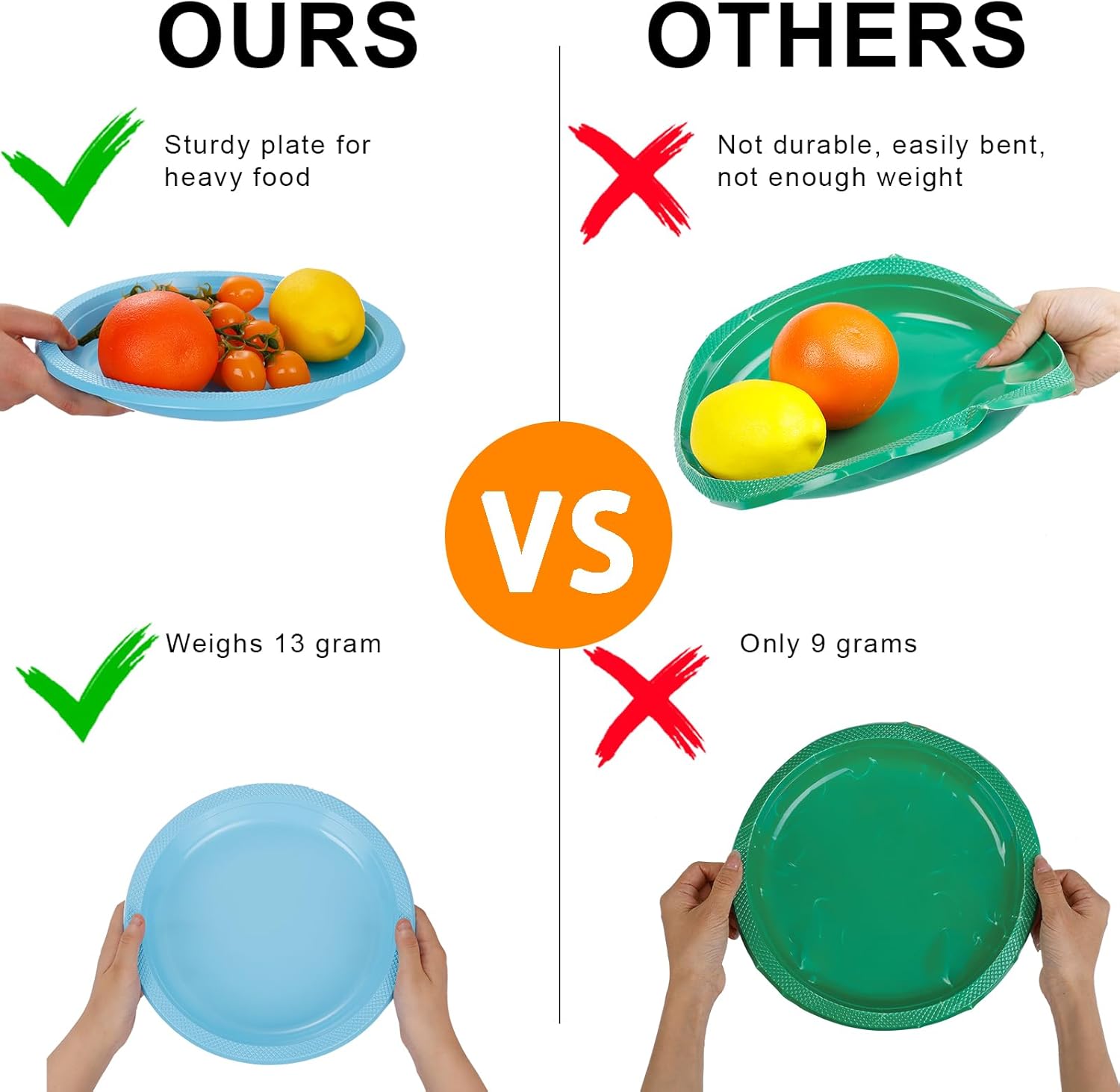 - 【Sturdy & Durable】 The high quality plastic plates for party are made of thickened plastic material, it is not easy to break, resistant to pressure and bending, not easy to crack. The thickened material can hold more food, hold hot food or cold drinks are not easy to leak, and fade-proof, effective leak-proof and oil-proof.