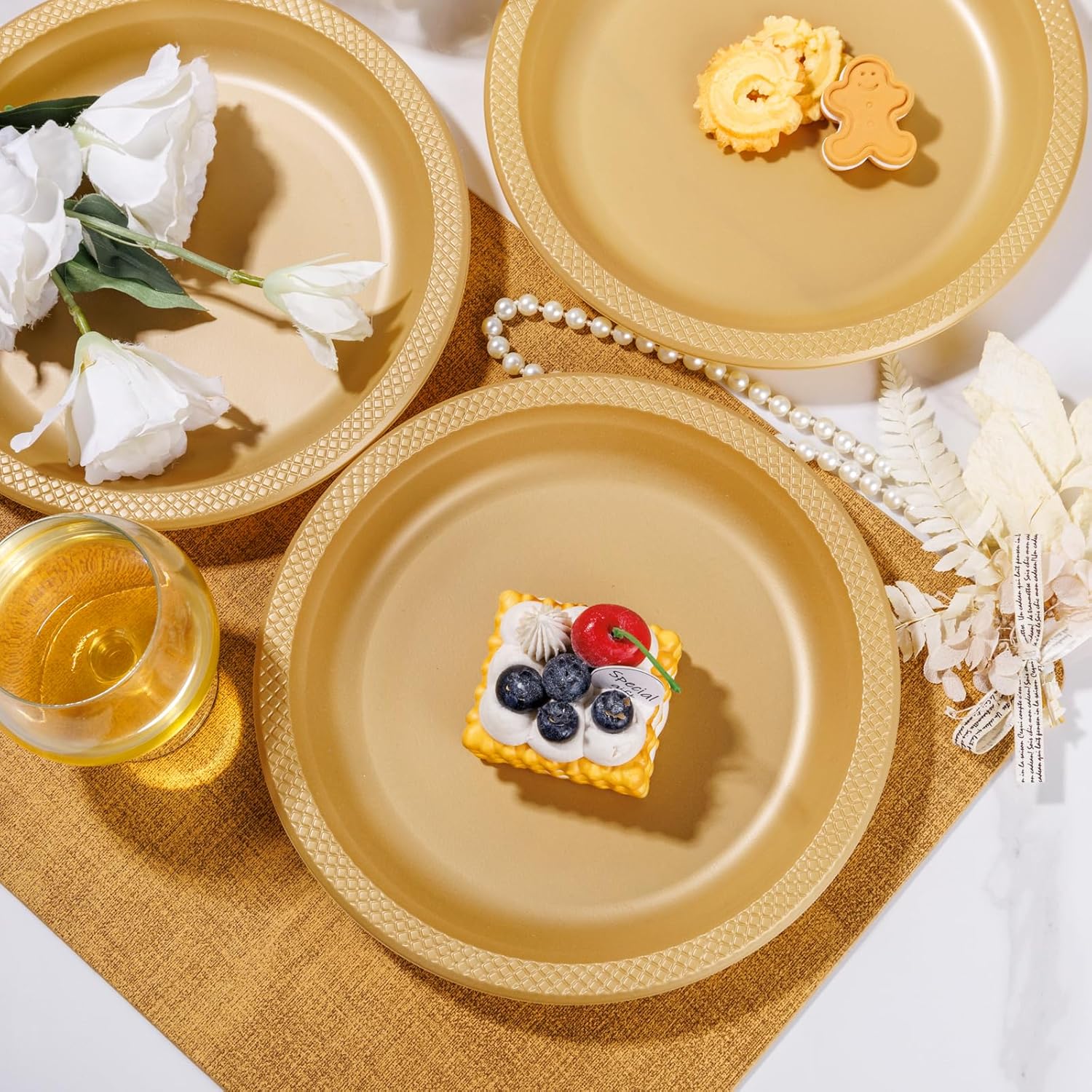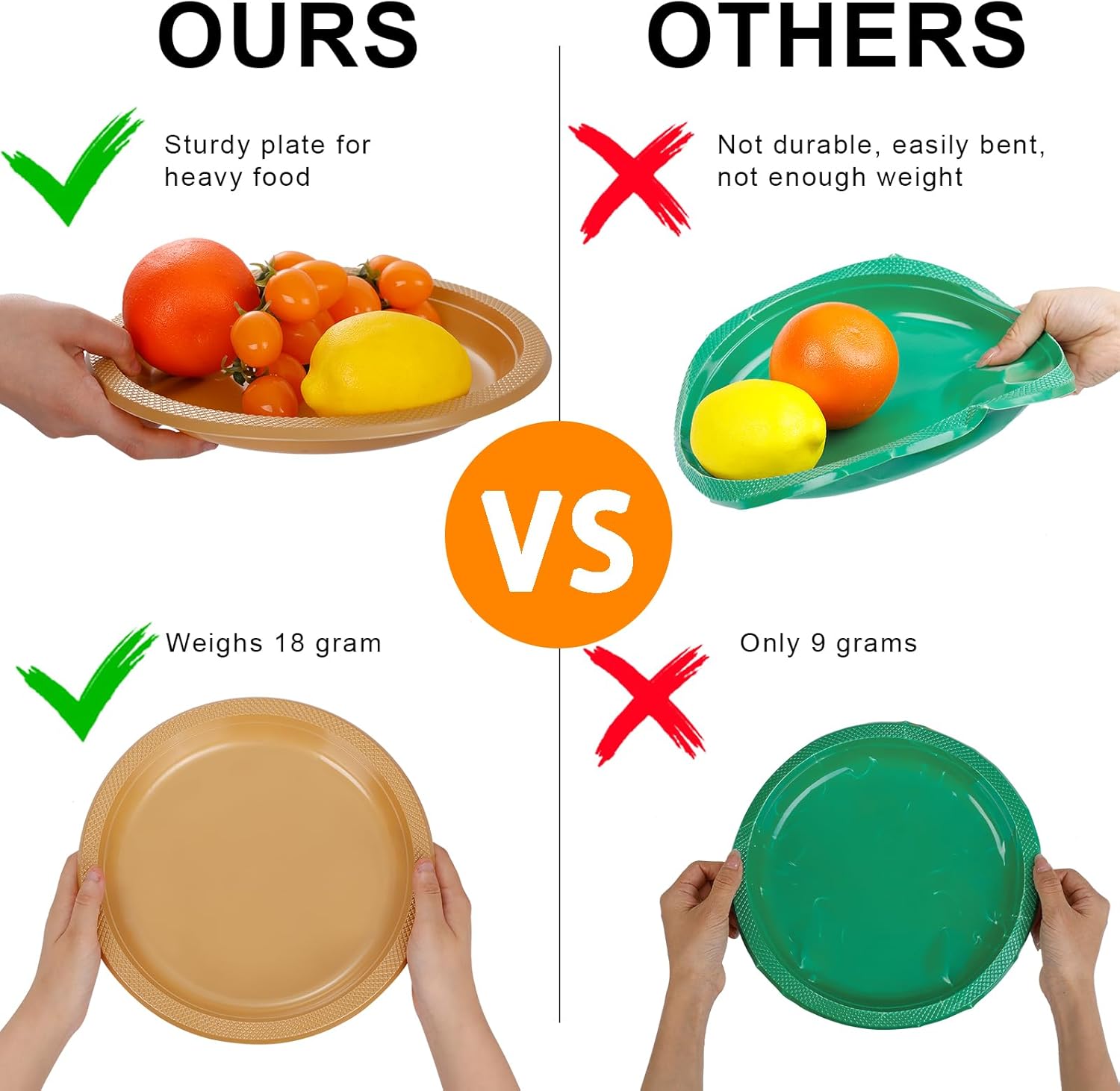 - 【Multi-Occasions Applicable】 Offering 9 inch plastic plates to meet different needs.Whether for parties, dining or daily use, these plastic plates are a necessity for a perfect dining experience. Simple and generous, elegant and vivid. These gold plastic plates disposable can match various festival themes,Thanksgiving Day and so on, brighten up the dining table atmosphere and add a sense of sophistication to your table decorations.