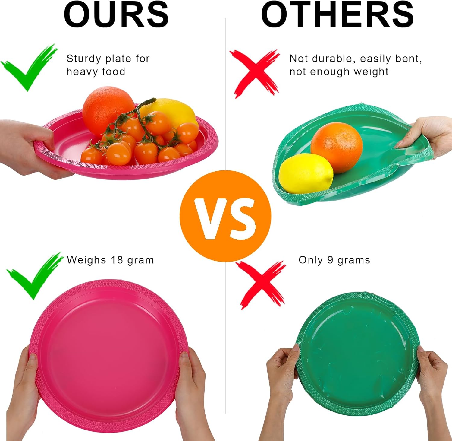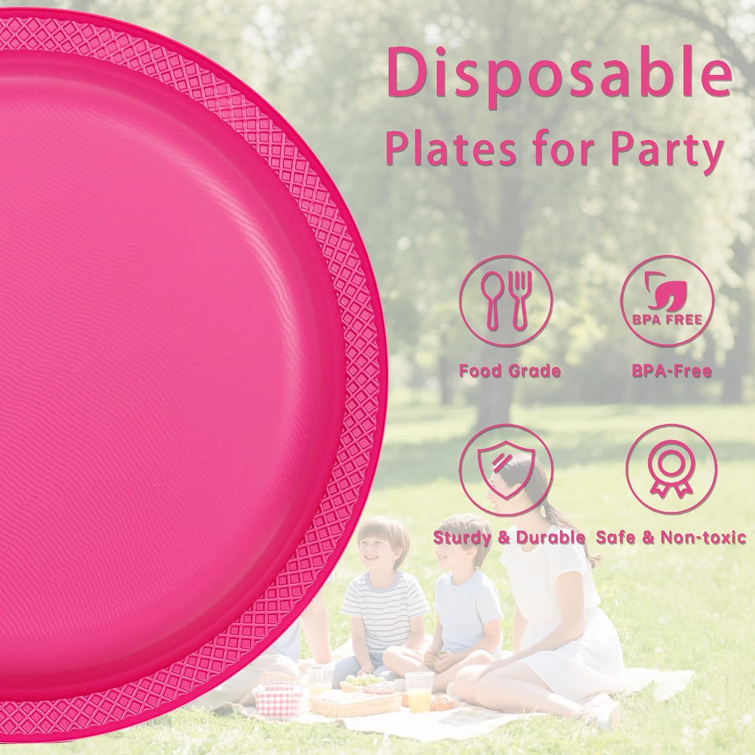 - 【Multi-Occasions Applicable】 Offering 9 inch plastic plates to meet different needs.Whether for parties, dining or daily use, these plastic plates are a necessity for a perfect dining experience. Simple and generous, elegant and vivid. These hot pink plastic plates disposable can match various festival themes and Daily activities, brighten up the dining table atmosphere and add a sense of sophistication to your table decorations.