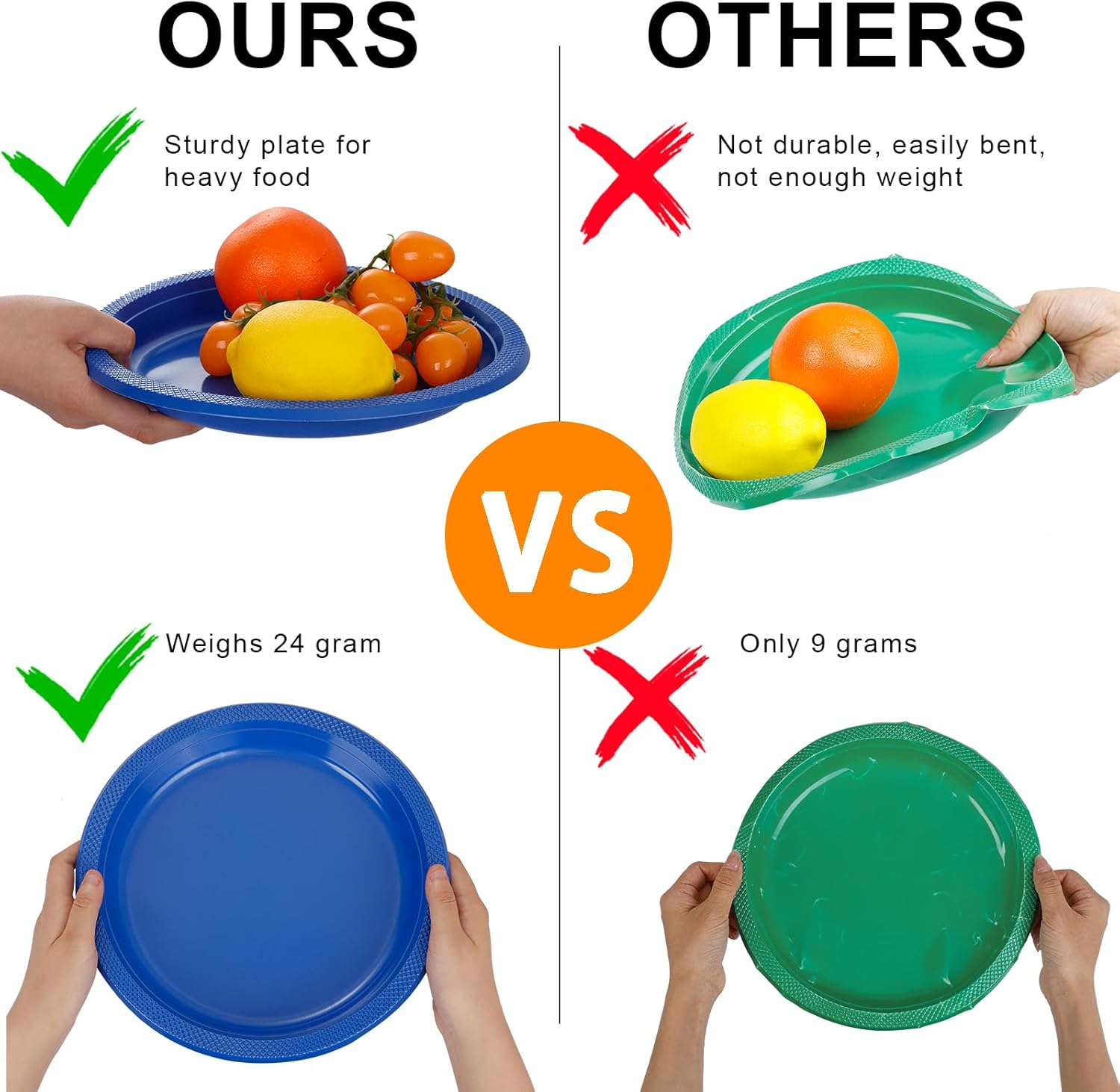 - 【Sturdy & Durable】 The high quality plastic plates for party are made of thickened plastic material, it is not easy to break, resistant to pressure and bending, not easy to crack. The thickened material can hold more food, hold hot food or cold drinks are not easy to leak, and fade-proof, effective leak-proof and oil-proof.