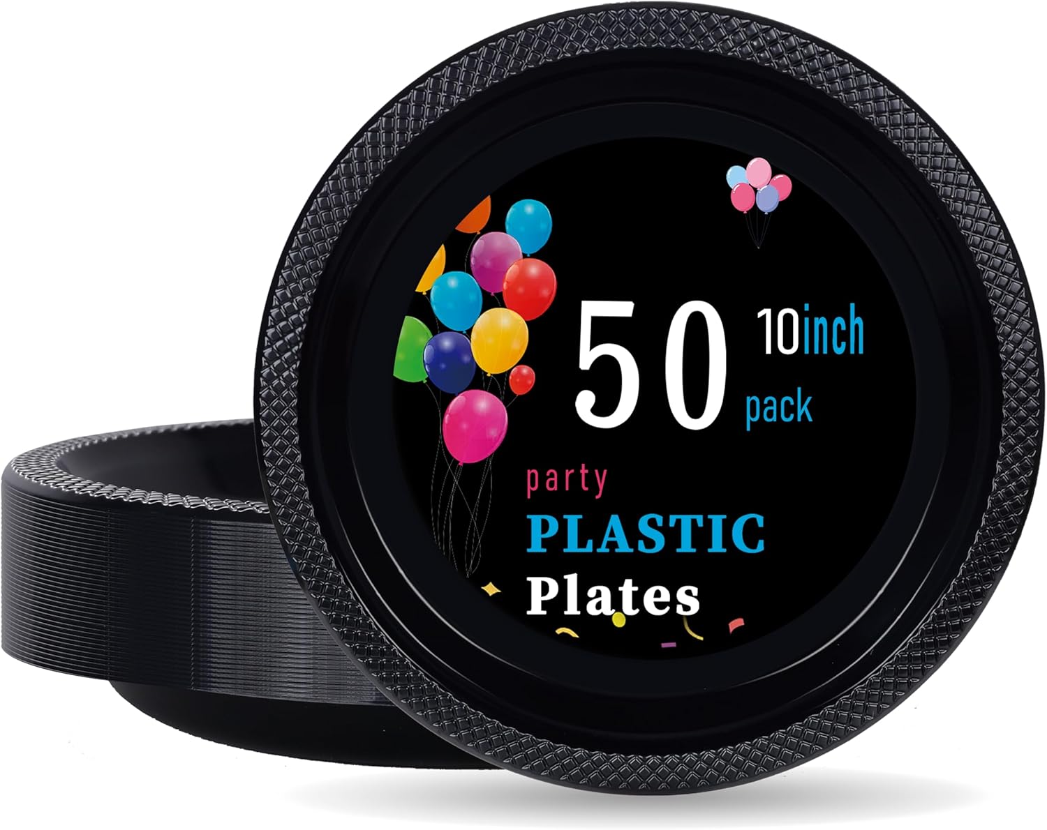 WELLIFE Black Plastic Plates 10 Inch 50 Count Disposable Plate for Party Halloween Plastic Plate, Large Big Plates for Dinner Party Supplies Birthday Camping BBQ