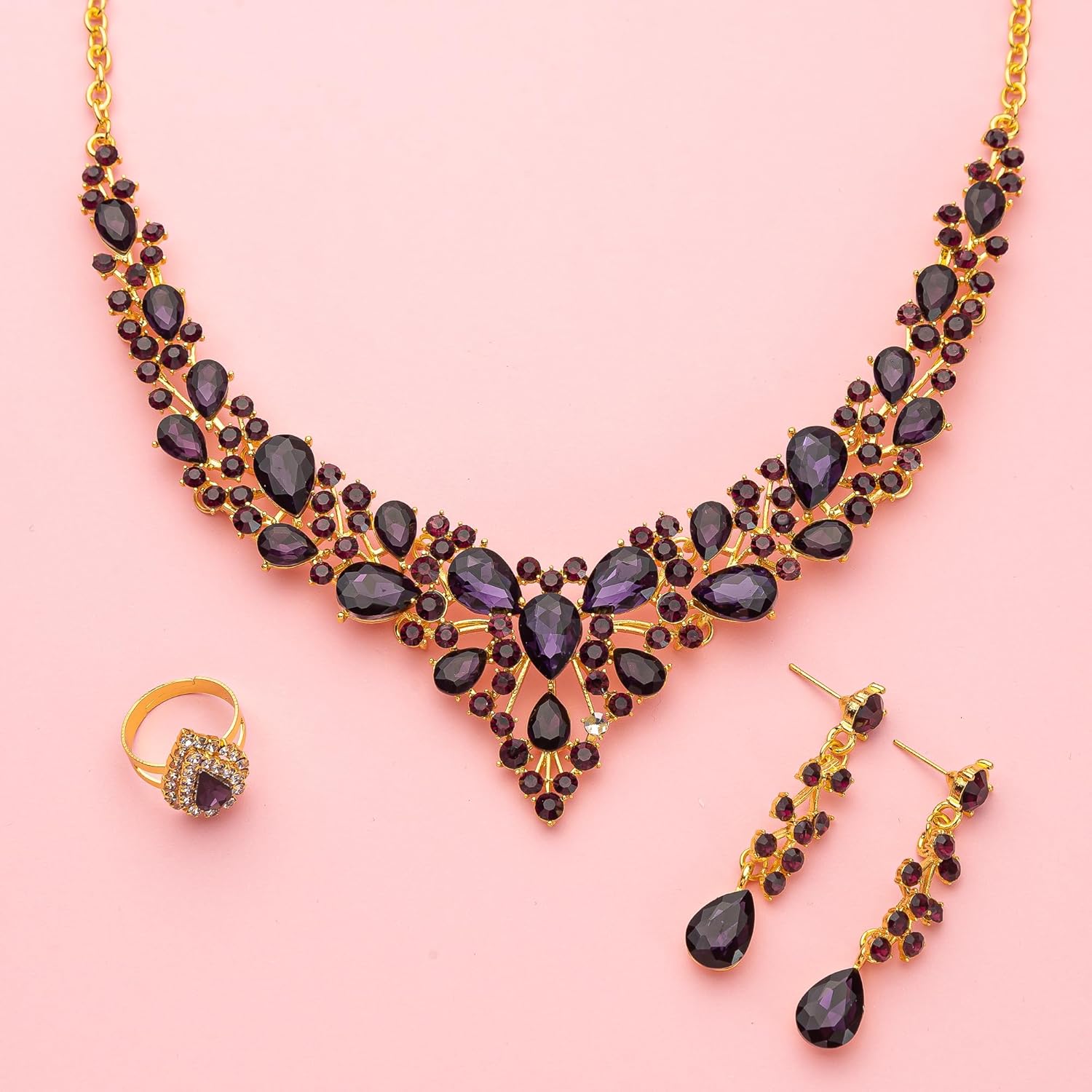 - Specification: Brand Name: Paxuan. Material: Silver / Gold Plated Zinc Alloy(environmental friendly and hypoallergenic) + Austrian Crystal. Size: Necklace: 16'' + 2'' Extension. Earrings: 2.5'' in length, 0.7'' in width. Bracelet: 6'' + 3.2'' Extension. Ring: Adjustable. Weight: 150g/set (Perfect weight, comfortable to wear). Color: Gold plated purple crystal.