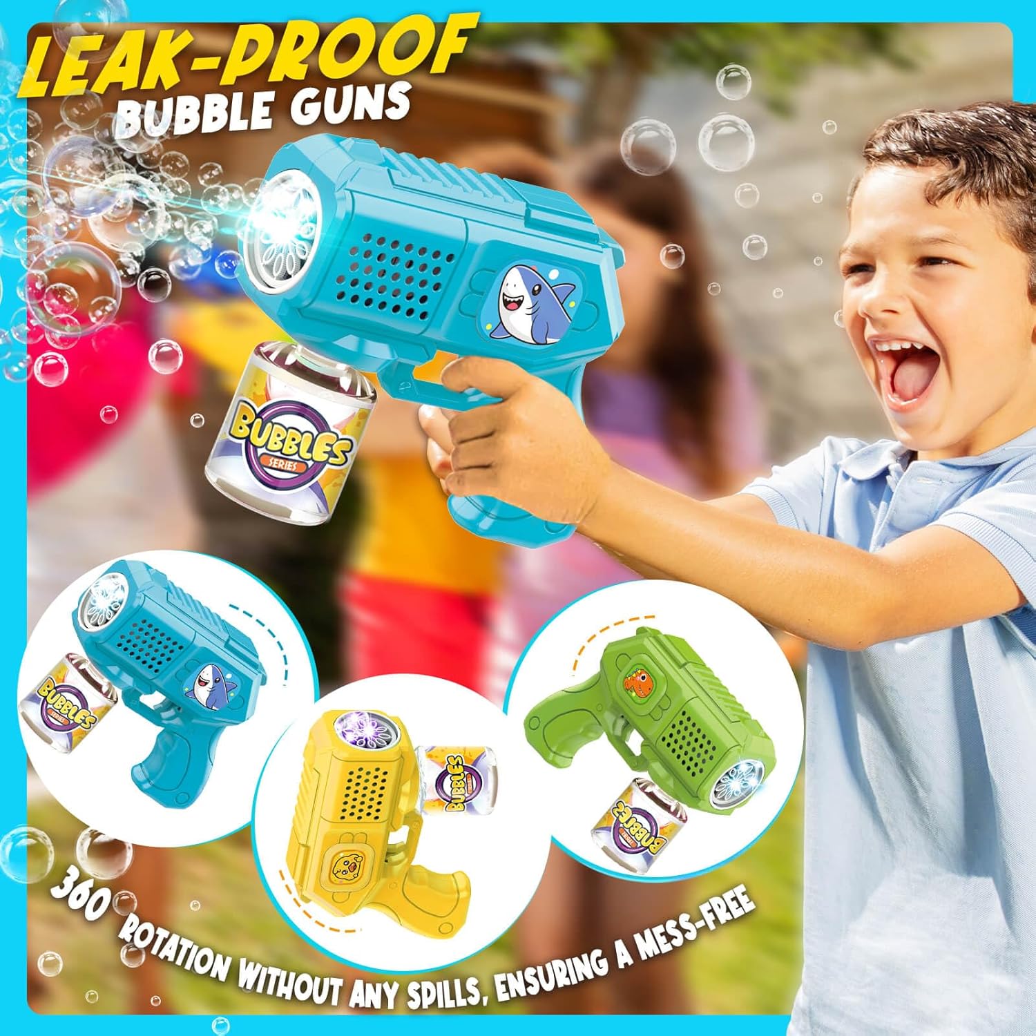 • Vibrant Bubbles with Light-Up Fun: This 3-pack bubble gun ensures triple the fun, over 5000 bubbles per minute, illuminated by light-up features that add excitement to every play session