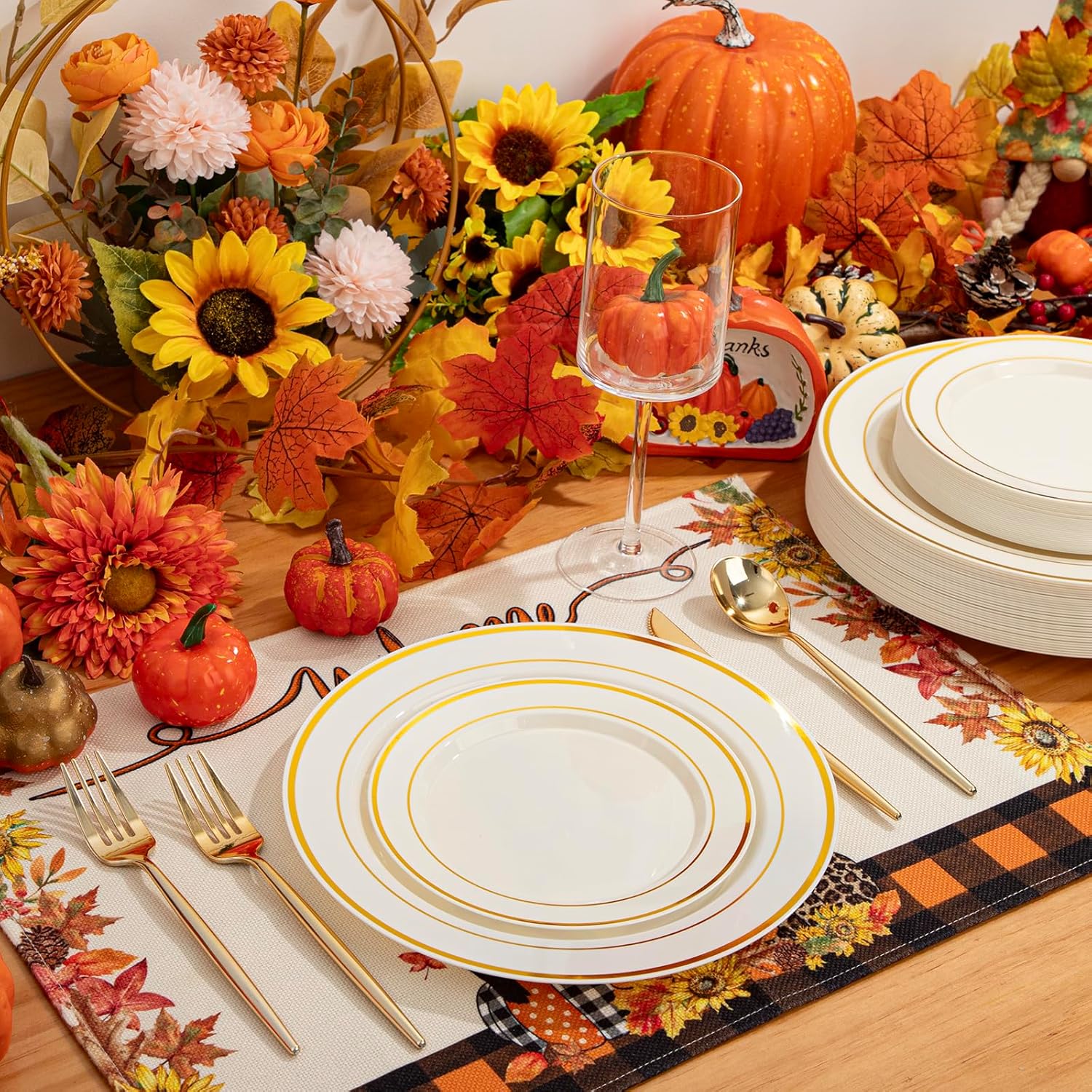 U-QE 100pcs Thanksgiving Plastic Plates for Party - Ivory Gold Plastic Plates Disposable Heavy Duty - Include 50 10" Dinner and 50 7" Dessert Plate, Perfect for Party, Wedding, Fall & Friendsgiving
