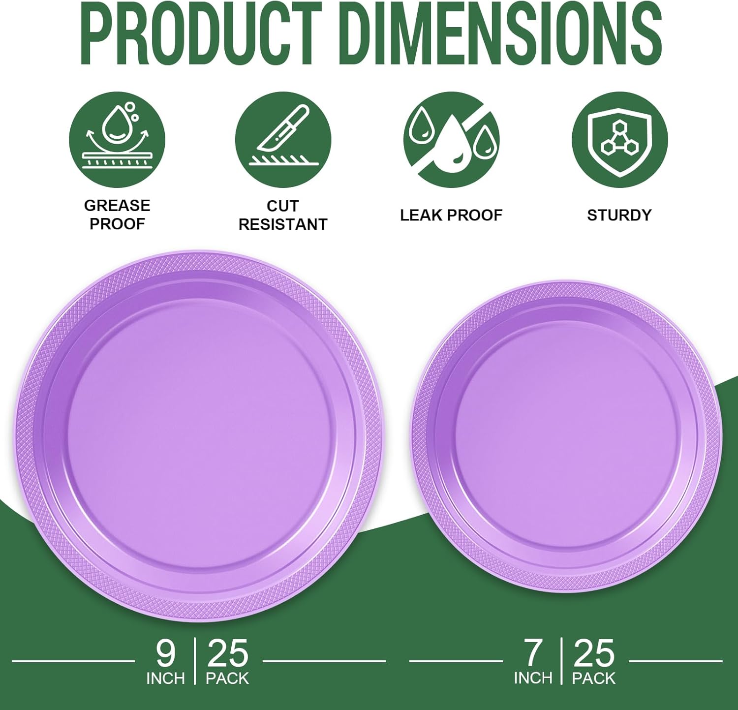 - What's Included: Disposable plastic plates set includes 25- 7" dessert plates and 25- 9" large dinner plates.