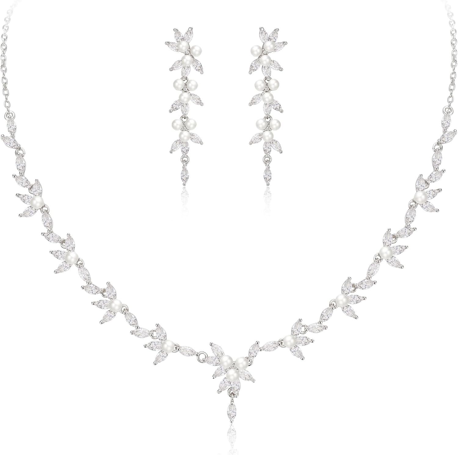 EleQueen Women's Simulated Pearl Wedding Jewelry Set, Cubic Zirconia Marquise Floral Bridal Necklace Earrings Bracelet Sets