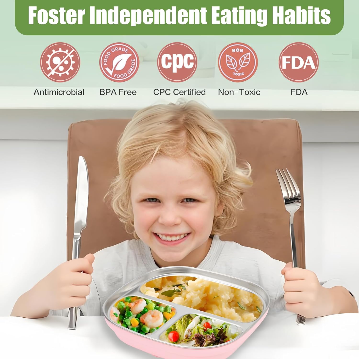 - Food-grade 304 stainless steel: The toddler stainless steel tray is made of high-quality food-grade 304 stainless steel, stainless steel is durable and shatterproof. The product has passed CPC certification and is freezer-safe, better protecting children's food safety.
