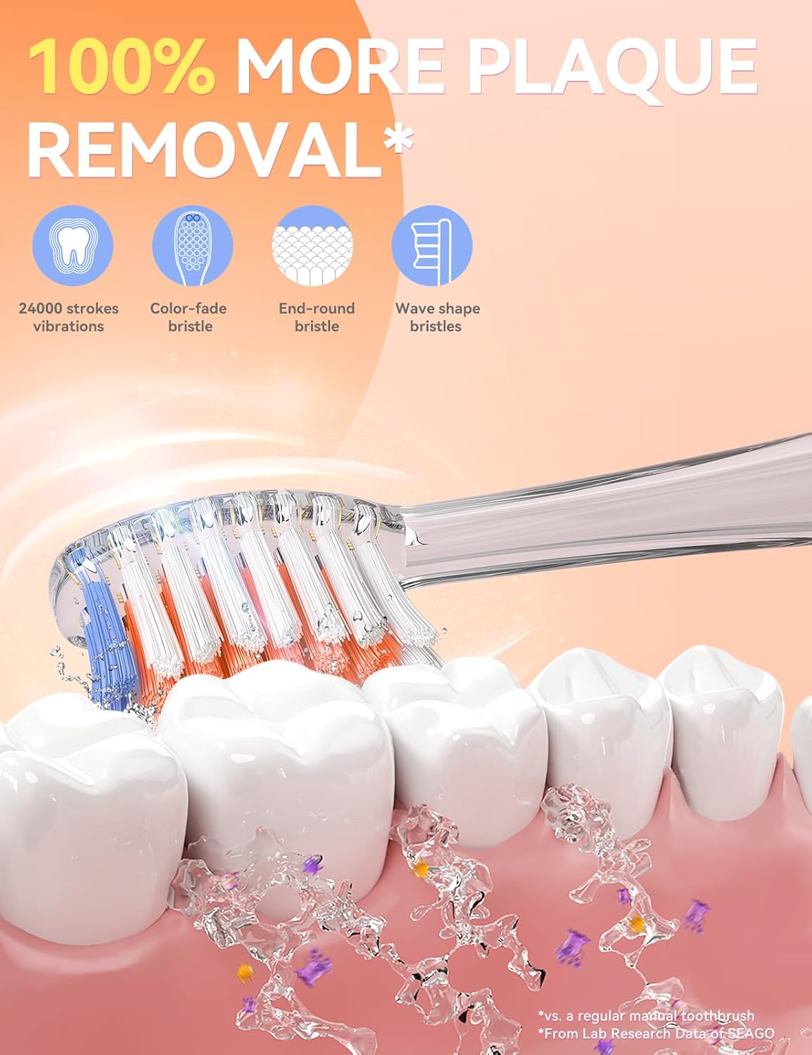 - Safe Materials and Timer: The SEAGO kids' sonic toothbrush handles are made of food-grade ABS and TPE, and the toothbrush heads feature soft bristles to safeguard children's tooth enamel. This kids' toothbrush includes a timer to help children achieve the dentist-recommended brushing duration