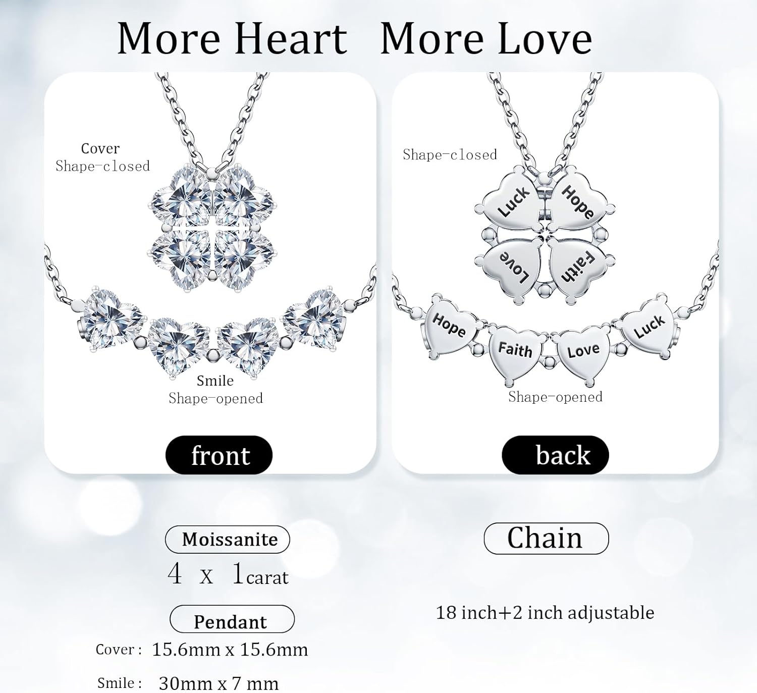 Luckylove 2-In-1 Four Heart Necklace for Women, 4 or 2 Carats Moissanite, Sterling Silver Jewelry, Anniversary Birthday Christmas Valentines Day, Special Gifts For Wife Girlfriend Daughter Her