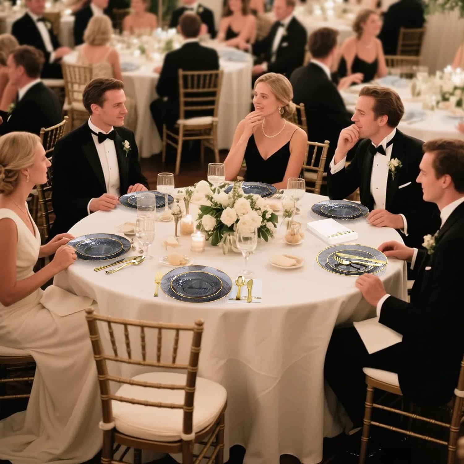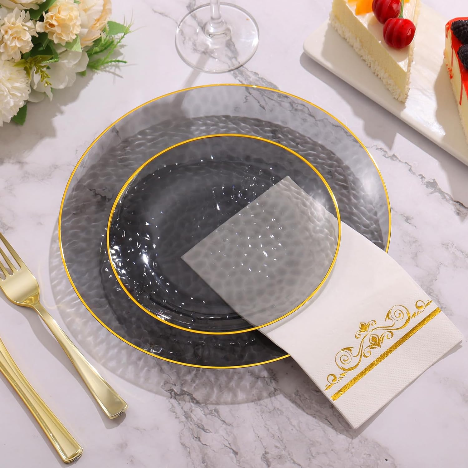 - Instantly Elevate Your Table Setting - Ditch the boring disposables! Our stunning black plates disposable for party feature a luxurious transparent black base, elegant gold trim, and a sophisticated hammered texture. Perfect for black and gold party decorations, black and gold birthday decorations, 50th anniversary decorations, retirement party decorations, happy new year decorations, or upscale thaksgiving party decorations. Makes any gathering feel upscale