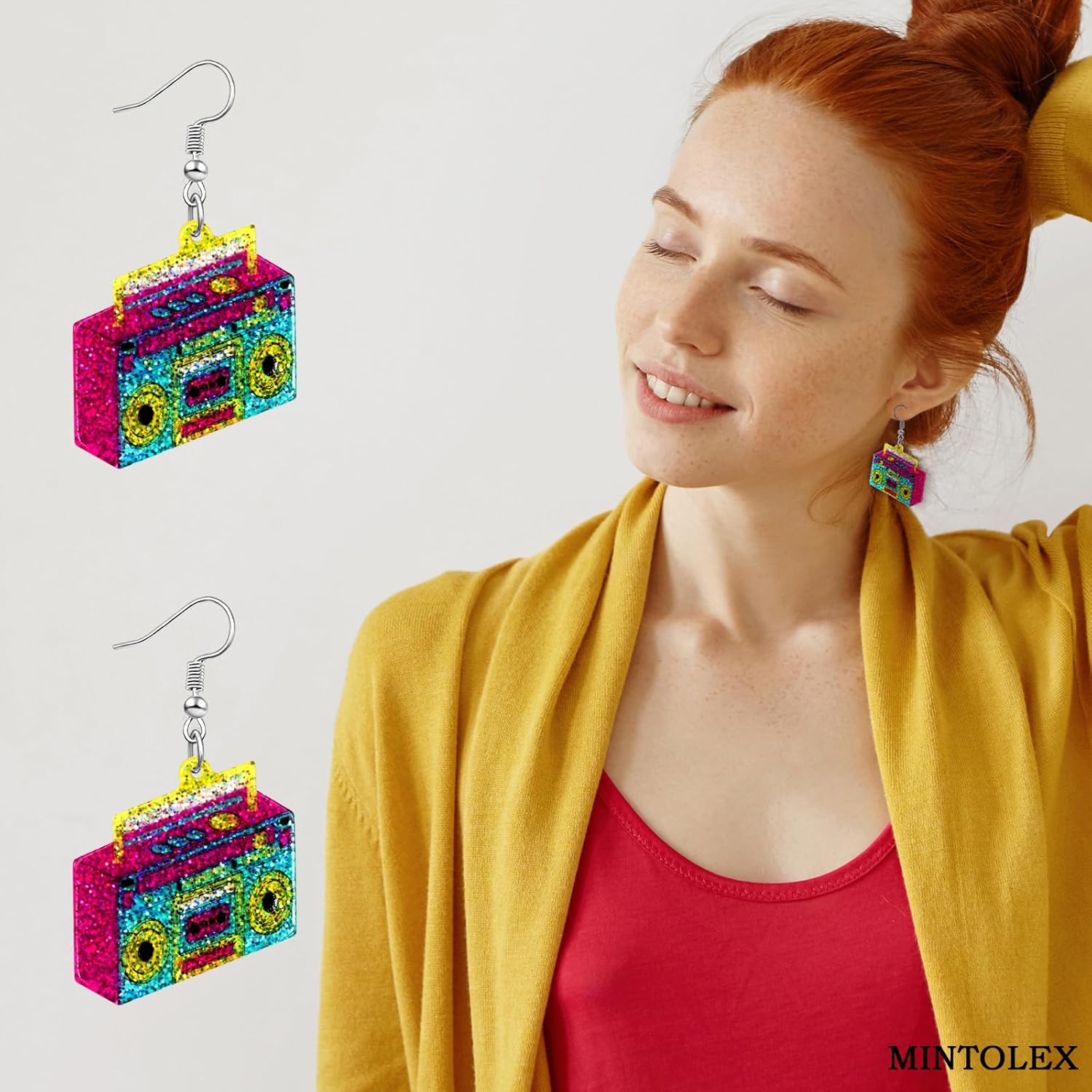 90s 80s Earrings for Women Retro Cassette Tape Earrings Acrylic Radio Tape Drop Dangle Earring for Halloween Cosplay Glow Party Music Festival Costume Accessories
