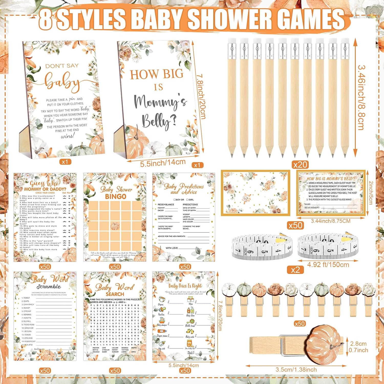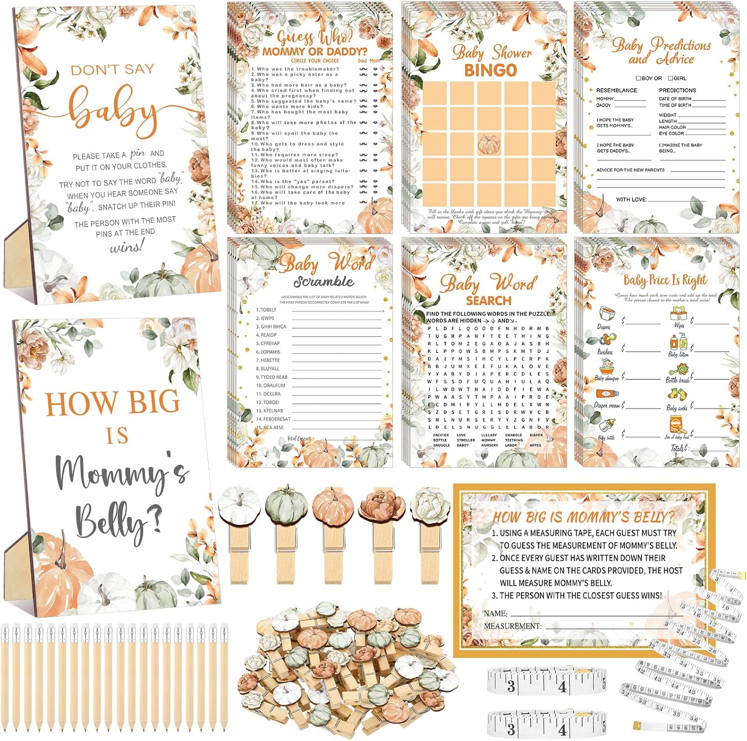 - Baby Shower Games Set: little pumpkin baby shower decorations includes 8 sets of little pumpkin theme games for baby showers in the package (each set includes 50 cards; A total of 300 cards and 20 pencils), 1 set of measure the belly baby shower game (including 1 piece of how big is mommy's belly sign, 50 pieces of guessing cards and 2 rolls of measuring tapes), and 1 set of don't say baby shower game supplies (including 1 piece of wooden don't say baby sign, 50 pieces of wooden clothespins)