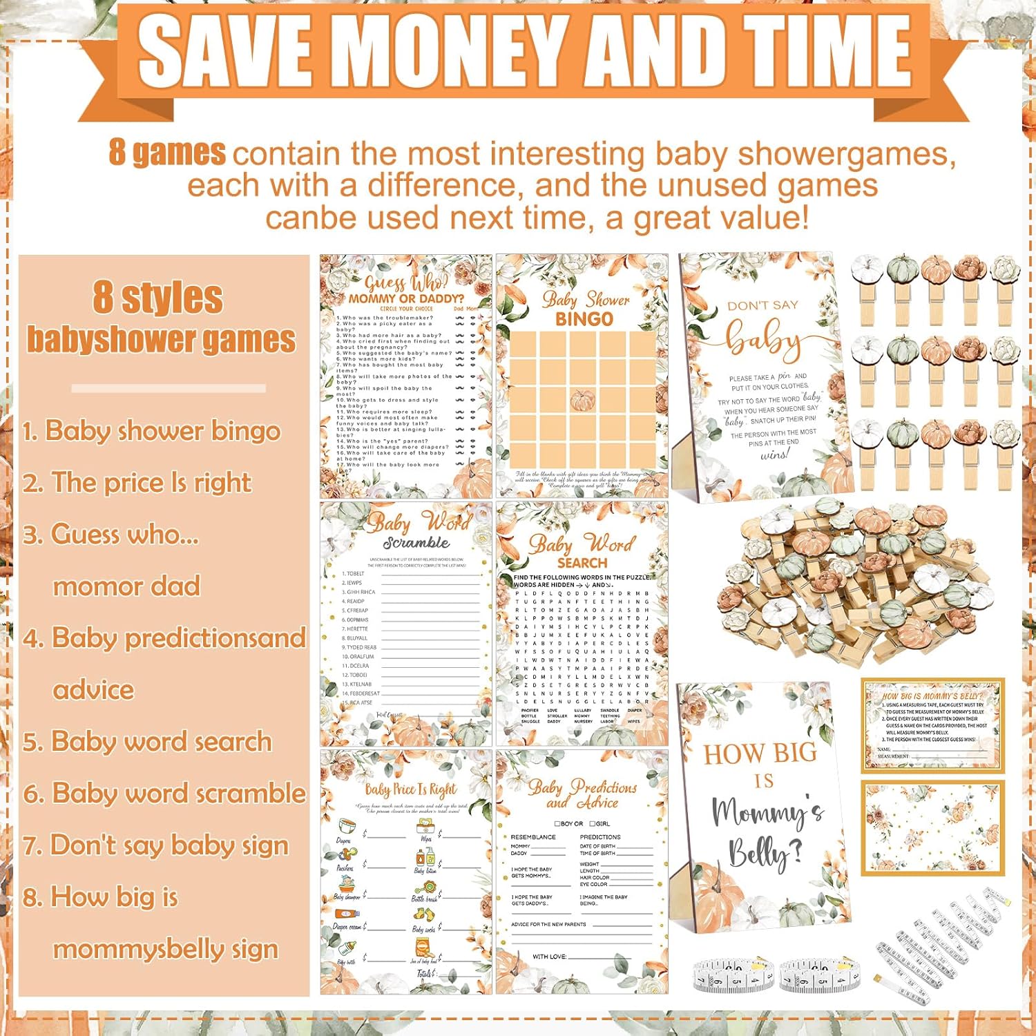 426 Pcs Little Pumpkin Baby Shower Games Set-8 Games, Includes Baby Shower Bingo, Price, Guess Who, Word Scramble, Prediction and Advice, How Big is Mommy's Belly, Don't Say The Words