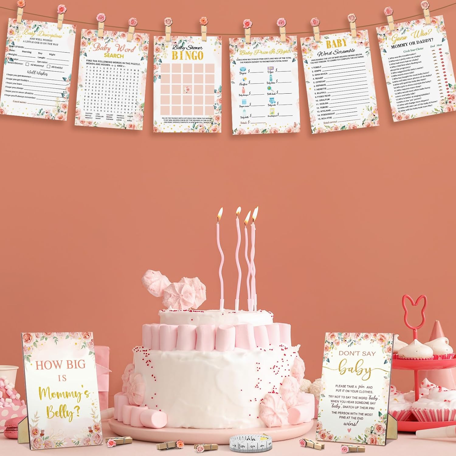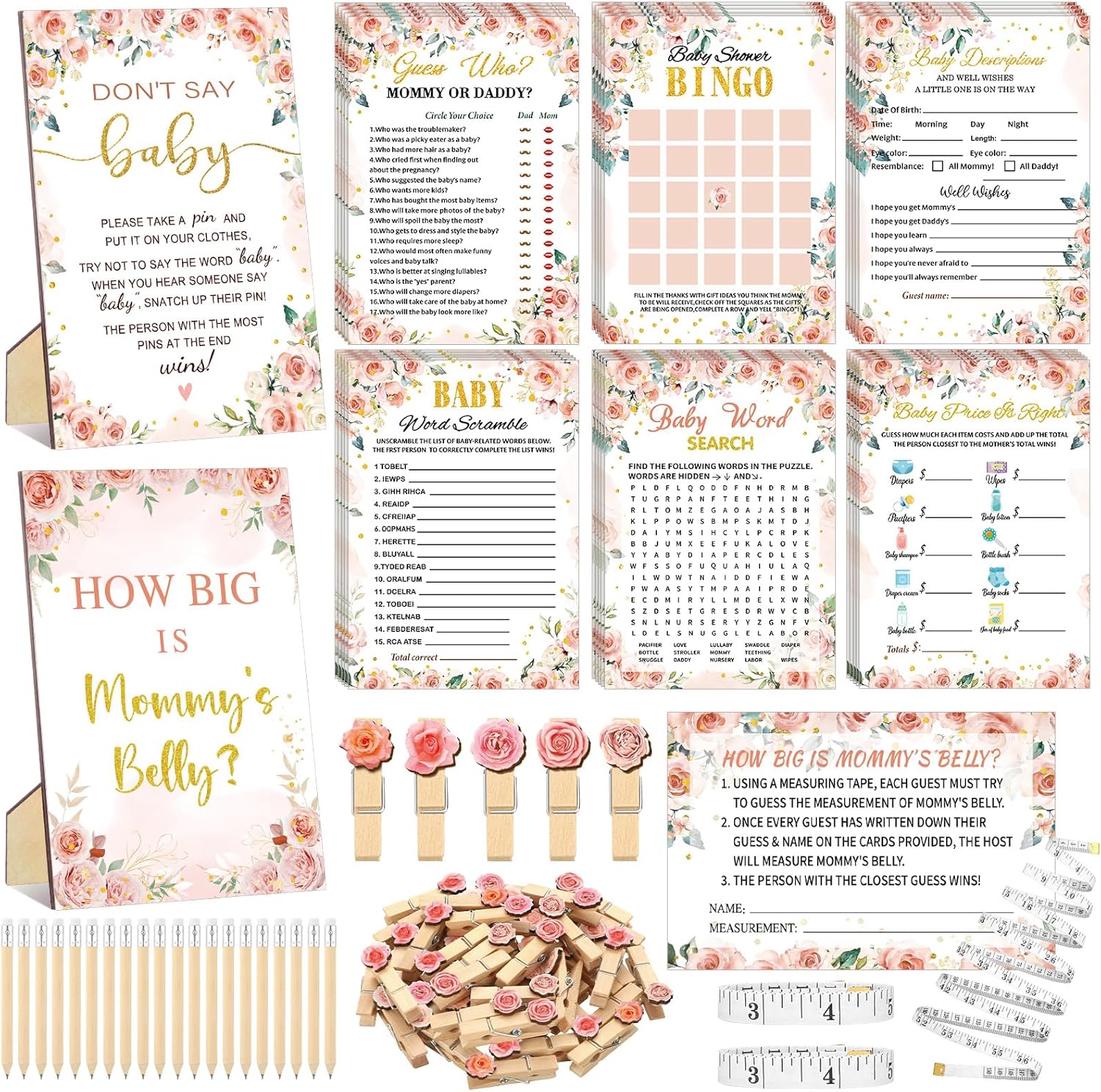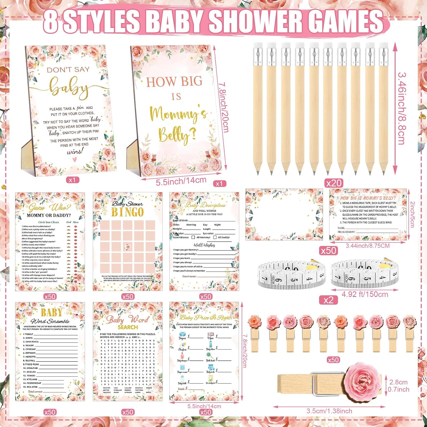 - Floral Baby Shower Games Set: floral baby shower decorations includes 8 sets of floral theme games for baby showers in the package (each set includes 50 cards; A total of 300 cards and 20 pencils), 1 set of measure the belly baby shower game (including 1 piece of how big is mommy's belly sign, 50 pieces of guessing cards and 2 rolls of measuring tapes), and 1 set of don't say baby shower game supplies (including 1 piece of wooden don't say baby sign, 50 pieces of wooden clothespins)