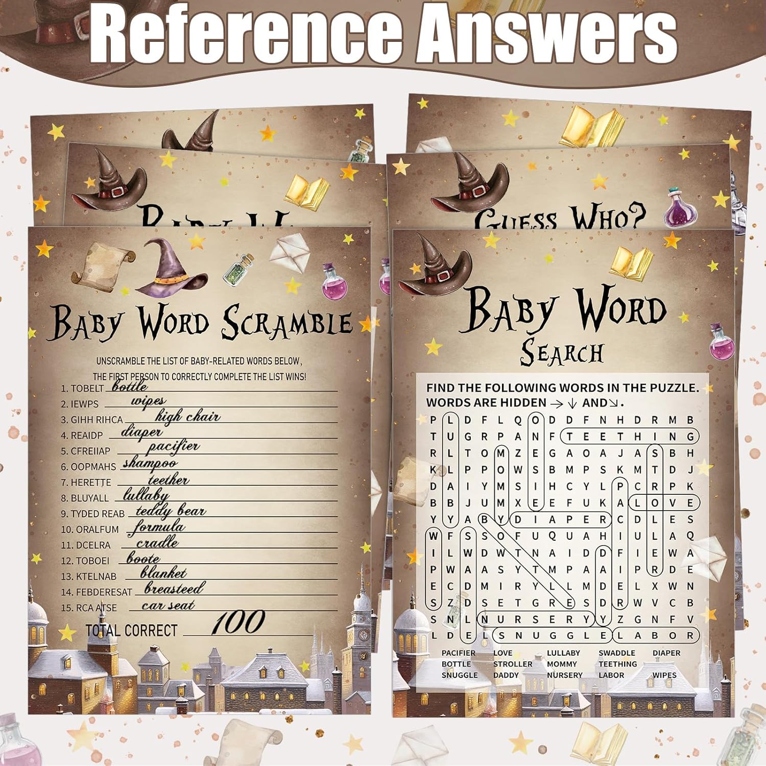 426 Pcs Magical Wizard Baby Shower Games Set-8 Games, Includes Baby Shower Bingo, Price, Guess Who, Word Scramble, Prediction and Advice, How Big is Mommy's Belly, Don't Say The Words
