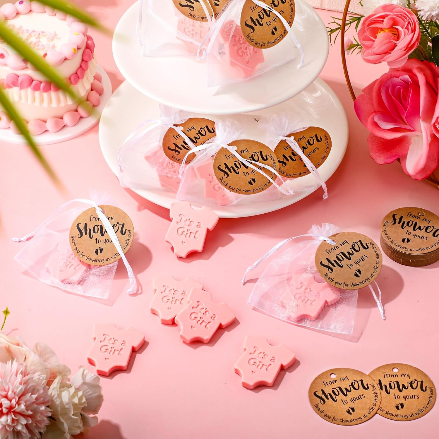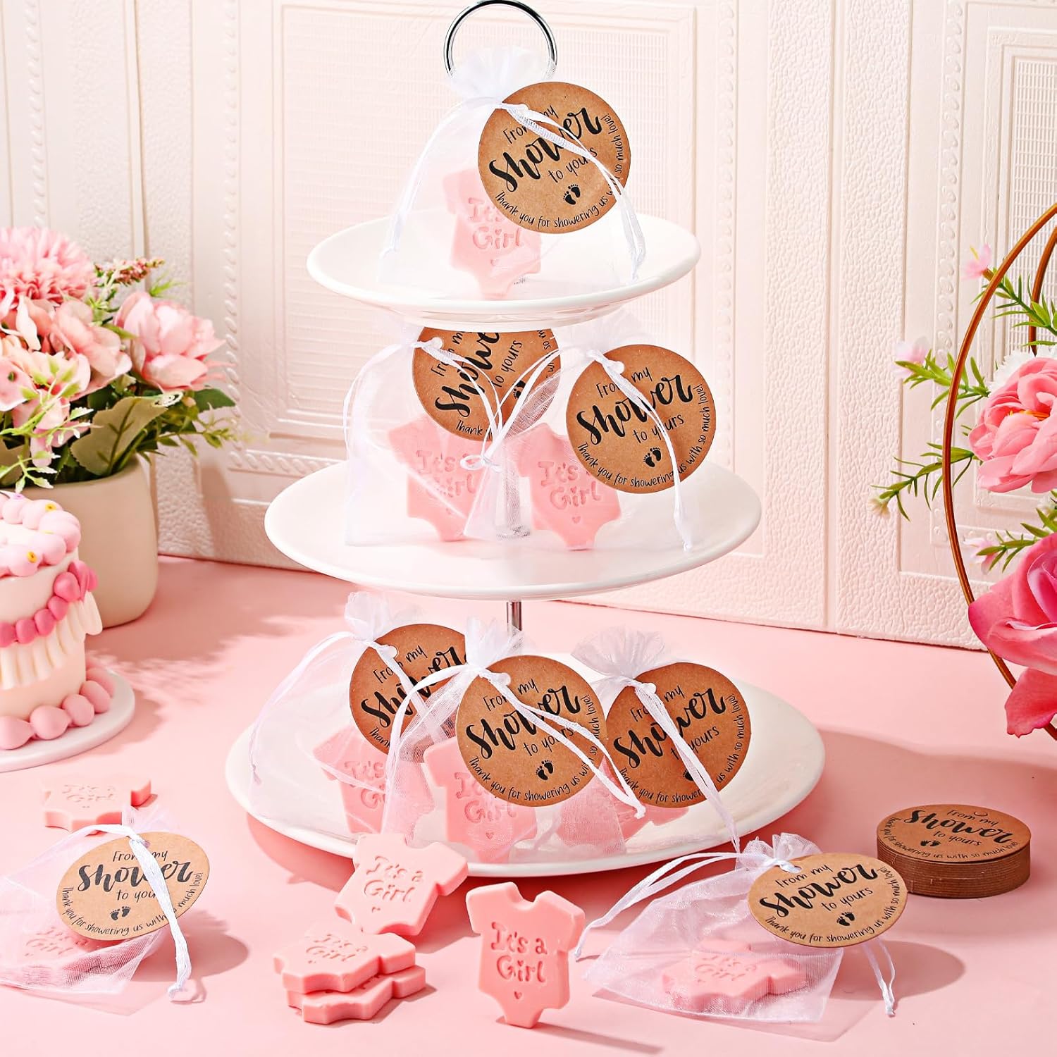 - Quality Material: our baby shower soaps are handmade with a natural vegetable oil soap base and glycerin; These ingredients lend your skin a gentle cleanse while simultaneously moisturizing it, ensuring a good user experience; This bundle also consists of thank you tags made of a quality 250g coated paper that is tough and resilient; Lastly, the elegant organza bag made from finely woven organza and equipped with a drawstring is suitable for holding the soaps and tags