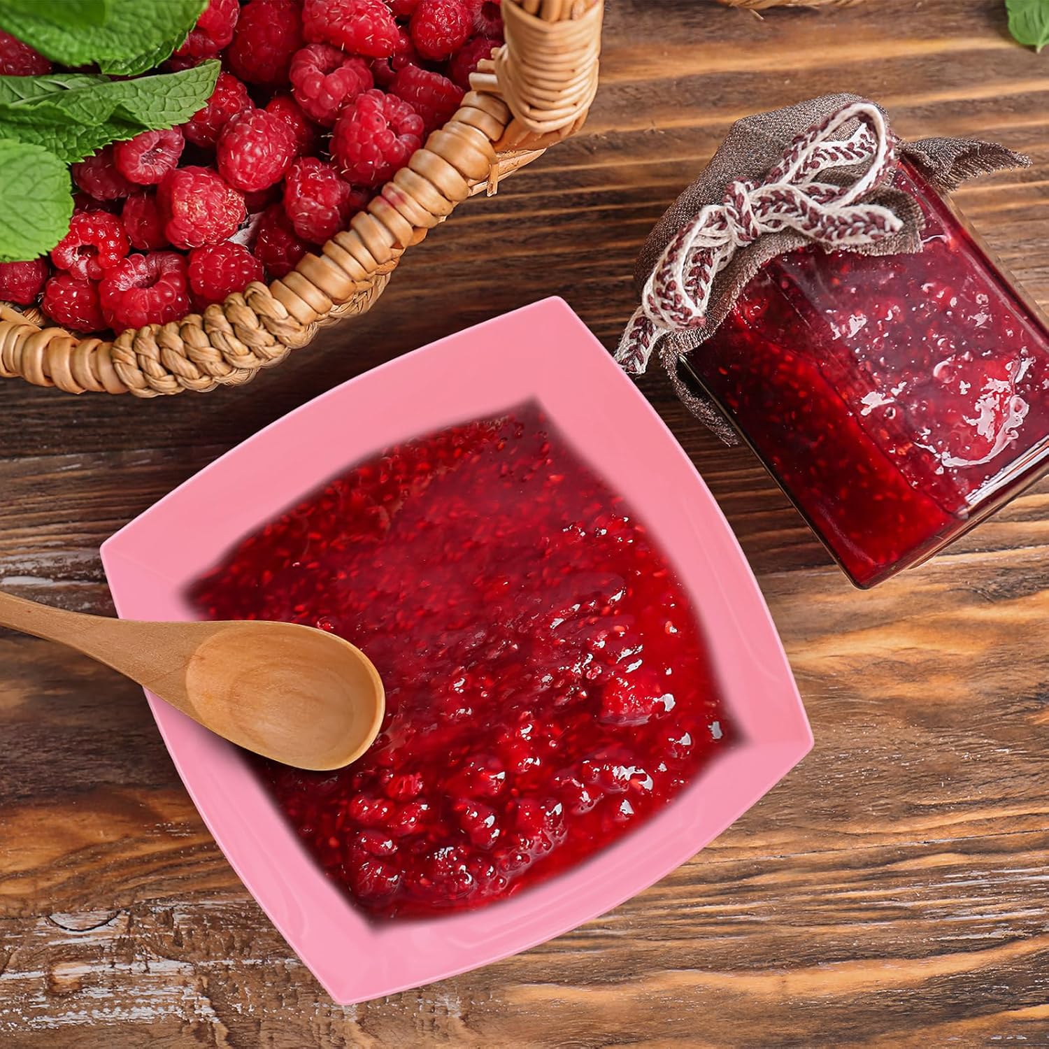 - What You Will Get: you will get 50 pieces of square plastic disposable bowls for parties altogether, available in pink, 8 ounces, suitable foods include generally snacks, salads, sauces etc; Suitable for parties, family dinners, holidays and so on
