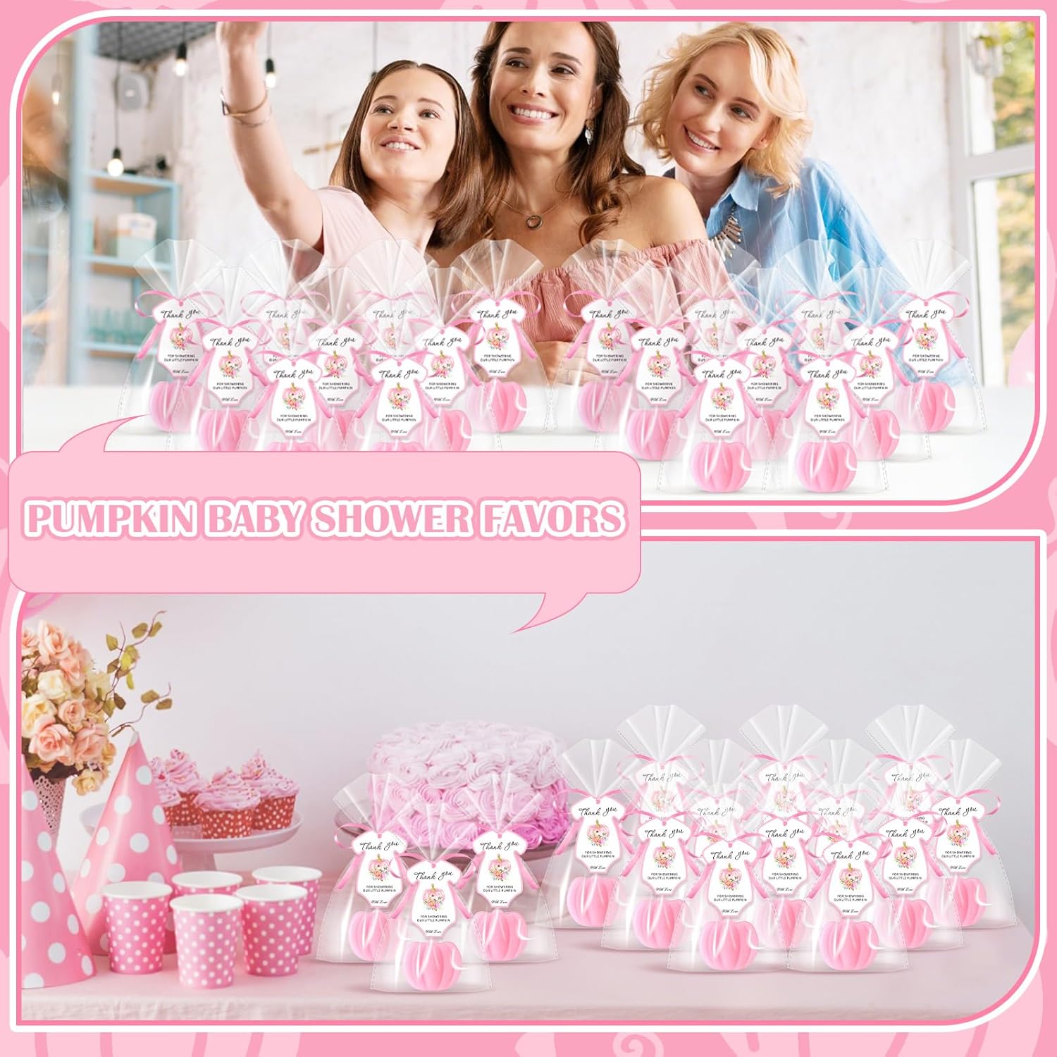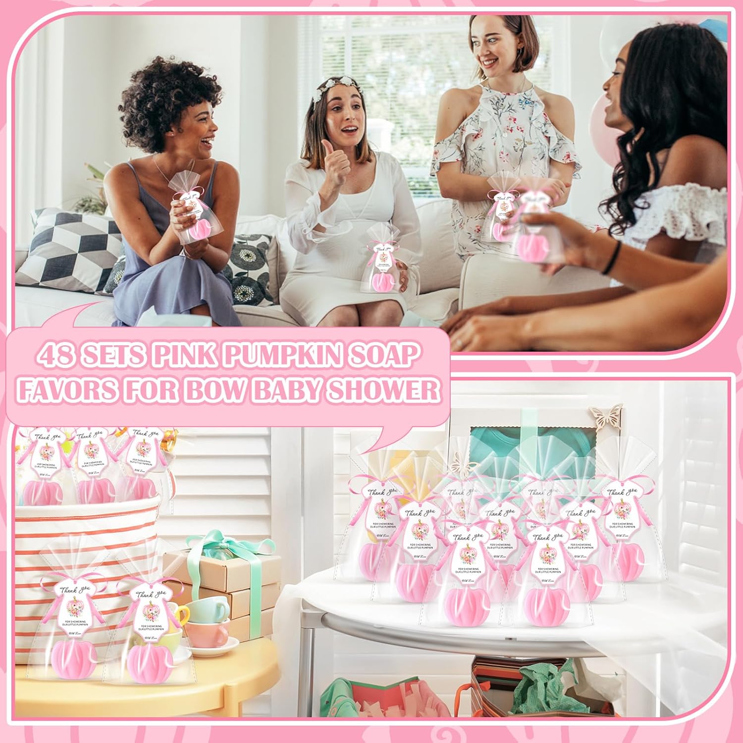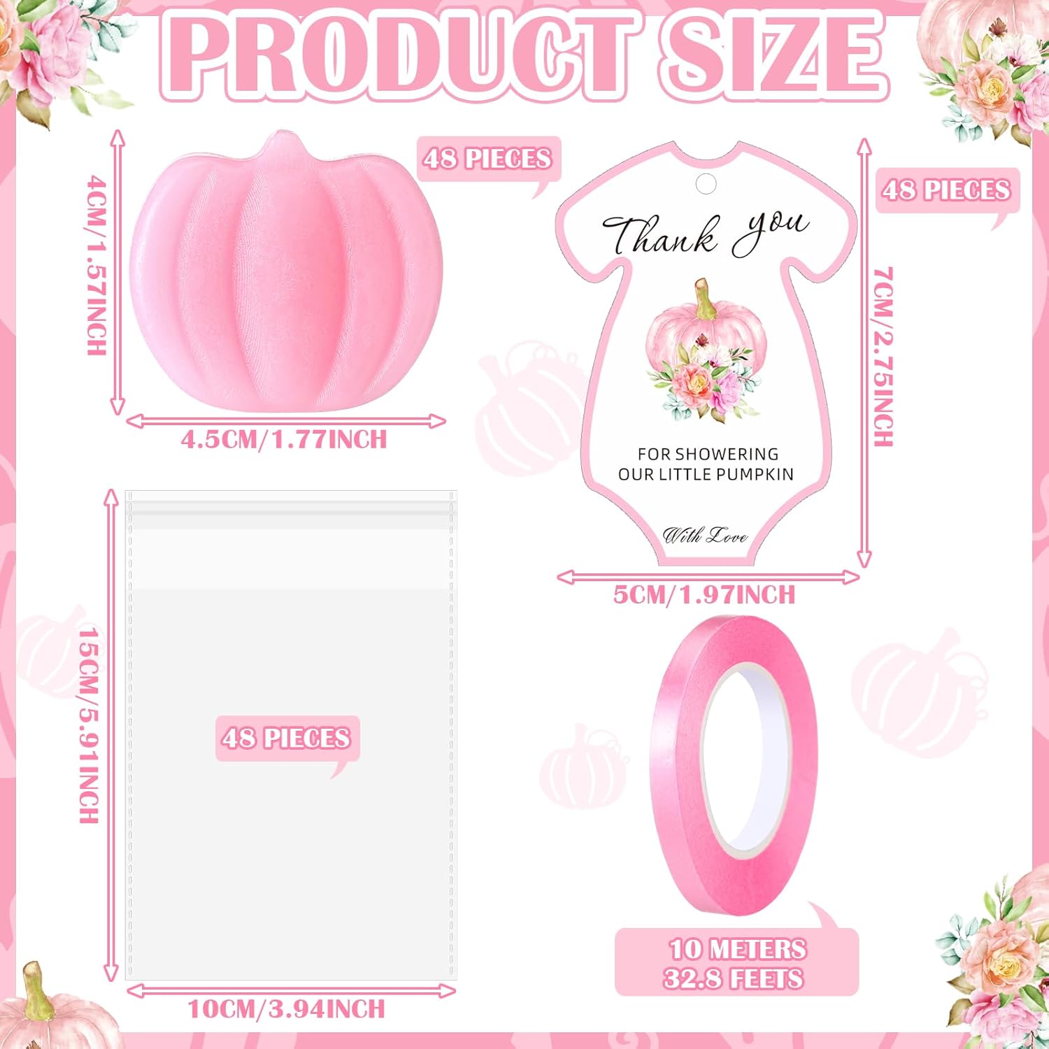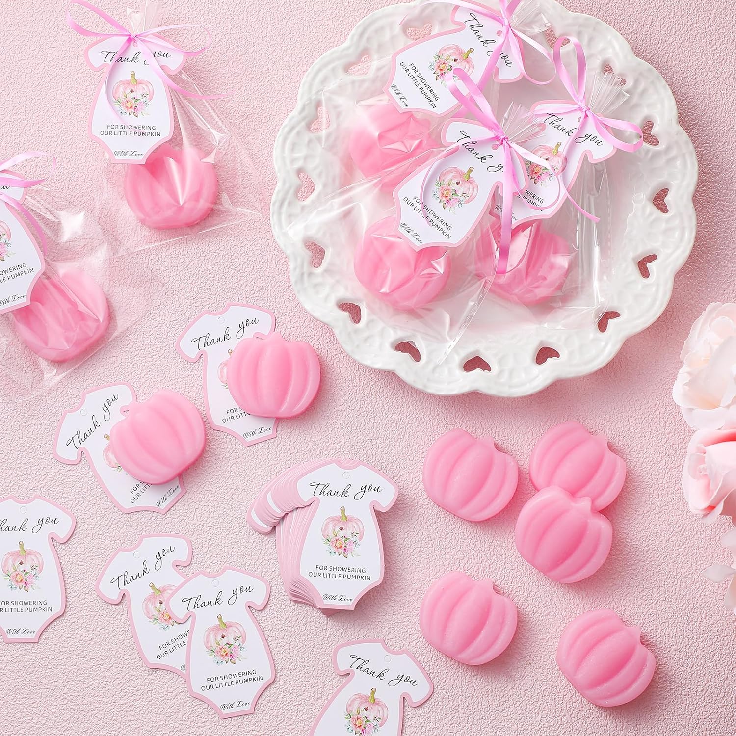 - Expressive Combination: this pumpkin soap baby shower favors set comes with 48 thank you cards measuring about 2.76 x 1.97 inches/ 7 x 5 cm, with holes punched on them for easy hanging, and 48 gift bags; Measuring 5.91 x 3.94 inches/ 15 x 10 cm, and a 10m pink ribbon, together expressing a complete and thoughtful thank you card and gift bag size ensures that they can comfortably and safely accommodate party favor soaps