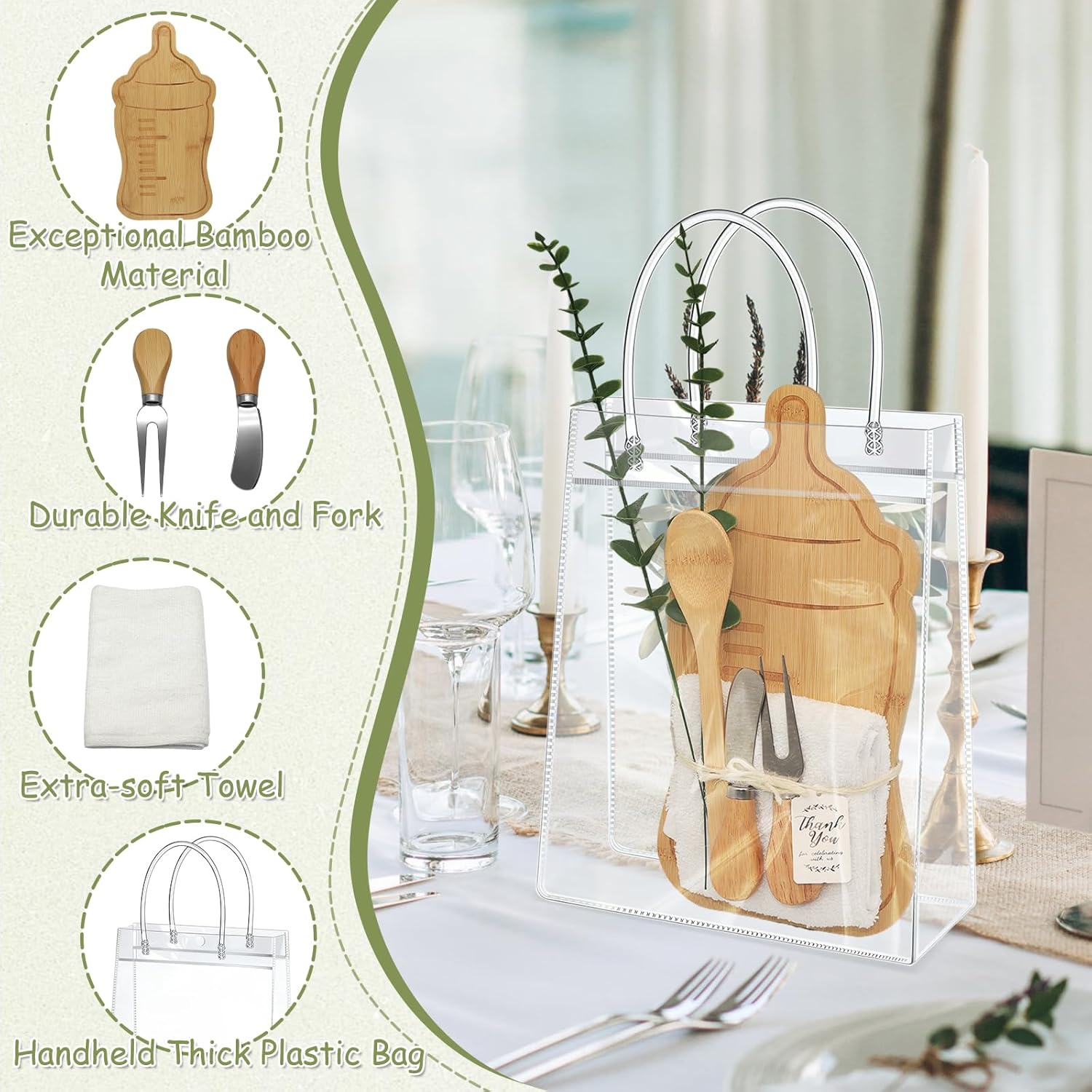 - 【6 Sets Gift-packs】These 6 gift-sets contain 55 items, including: 6 cheese boards, 6 spoons, 6 forks, 6 butter knives, 6 towels, 6 thank-you cards, 6 present bags, 12 artificial eucalyptus stems and a roll of rope. Rich in variety, not only exquisite but also practical and is the best choice for baby shower favors