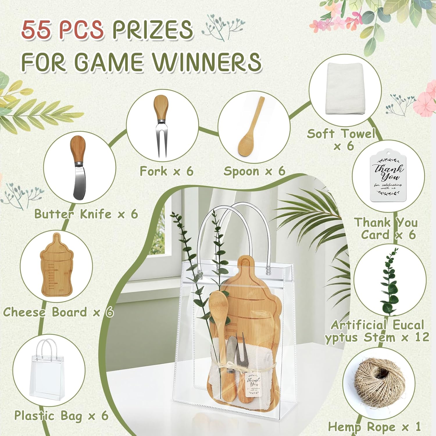 AZEAM 55Pcs Baby Shower Prizes for Game Winners, Bridal Shower Prizes with 6 Sets Bottle Cheese Board Spoon Fork Butter Knife Towel Card Plastic Bag Branch, Wedding Shower Favors for Guests