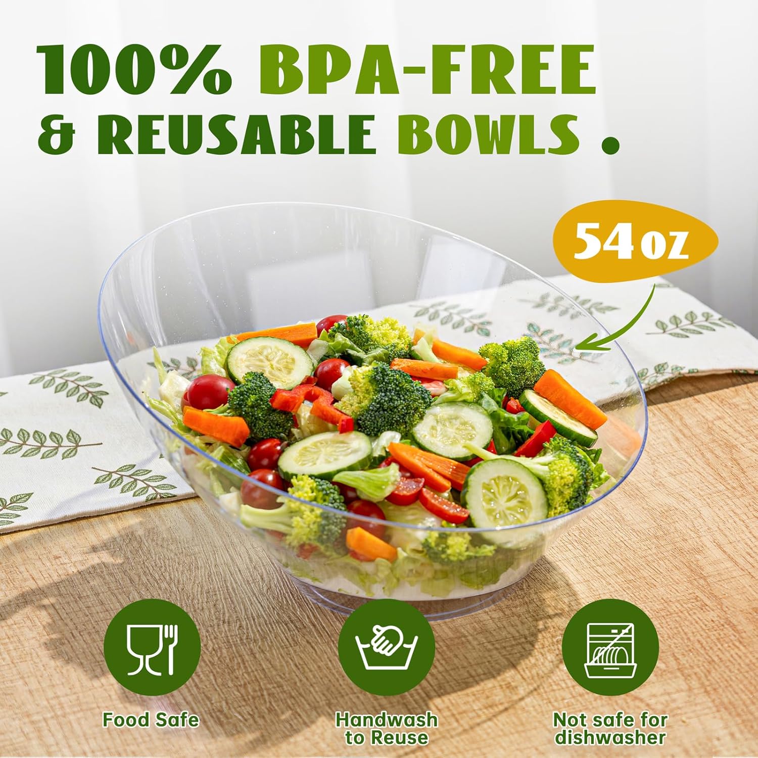 - QUALITY AND SERVICE - Our 54-ounce clear plastic bowls are ideal for family gatherings, parties, holidays, and movie nights. They can be used as plastic bowls, party bowls, or disposable bowls for snacks, salads, or desserts. We are committed to providing high-quality products and customer satisfaction. If you are not satisfied, we will resolve the issue with friendly and efficient service so that you can trust us with confidence.