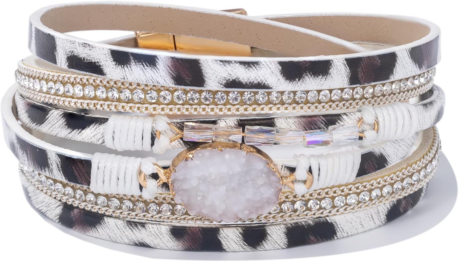 - Unique Design: Zebra pattern leather bracelet wraps around your wrist and sparkles with strands composed of resin stone and a single strand featuring crystal beads.