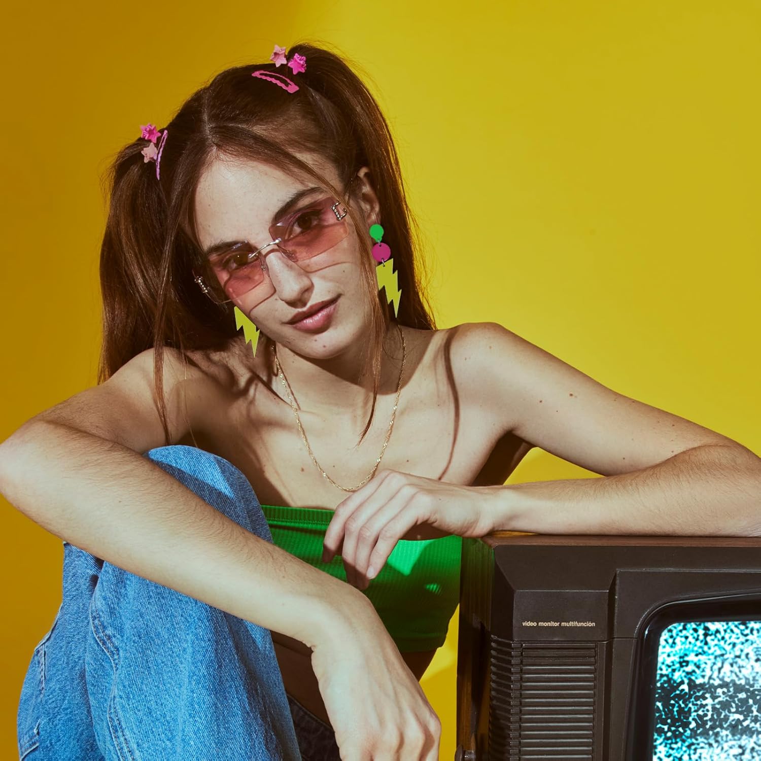 - Retro 80s Neon Earrings: Inspired by the bold and funky fashion of the 80s and 90s, these neon earrings feature playful double circle and lightning bolt design that captures the era's vibrant energy. The striking color contrast ensures you stand out at any party.
