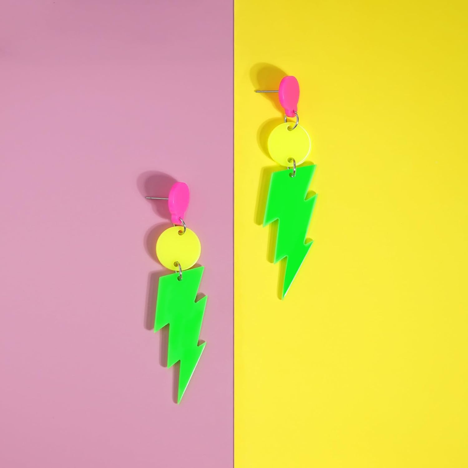 - Retro 80s Neon Earrings: Inspired by the bold and funky fashion of the 80s and 90s, these neon earrings feature playful double circle and lightning bolt design that captures the era's vibrant energy. The striking color contrast ensures you stand out at any party.
