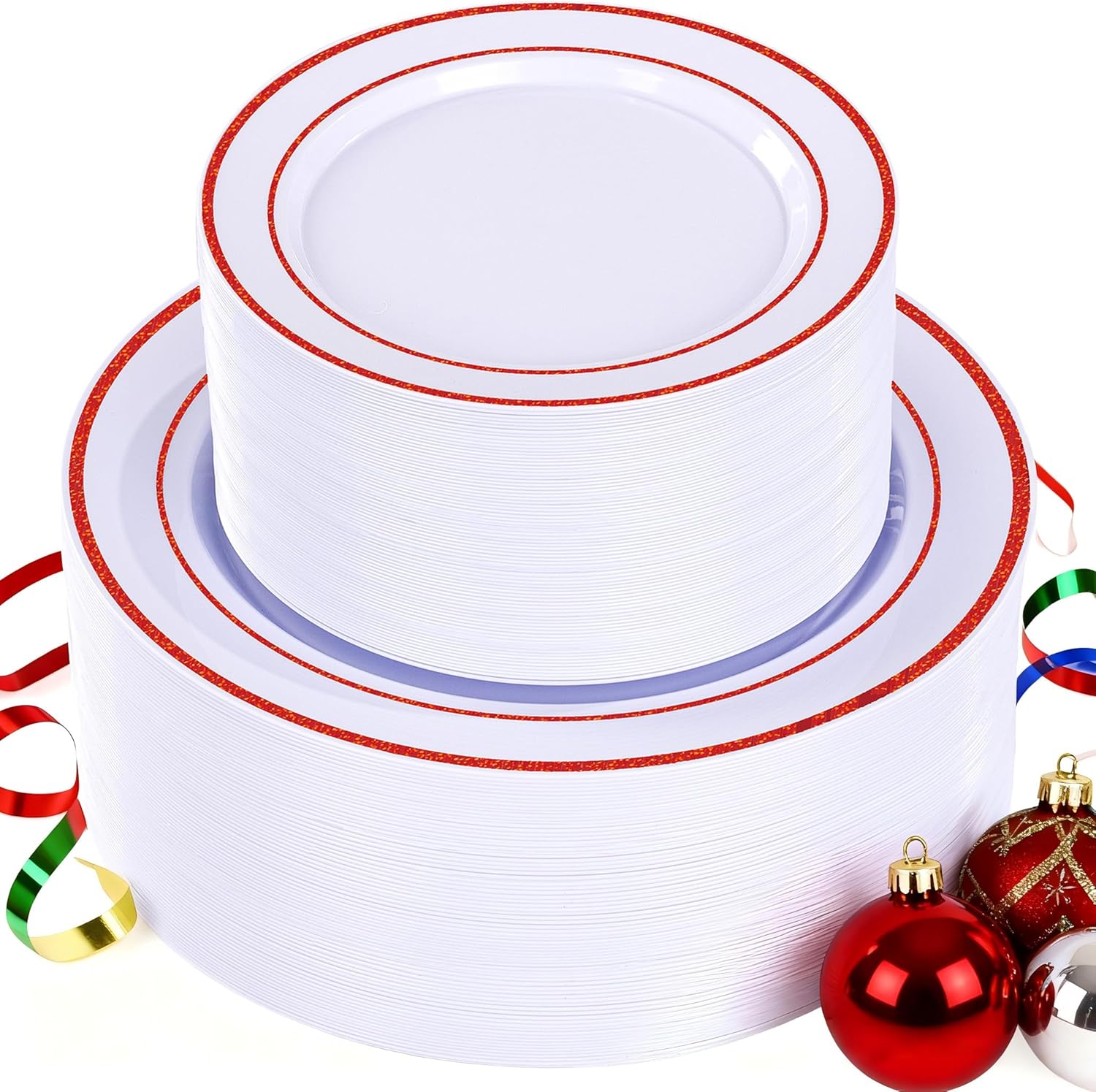 - Trendy! Stylish! Elegant! : Elevate your parties with these fancy disposable plates! Adorned with a delicate glitter red trim that complements silverware to perfection, their elegant design is a feast for the eyes. Crafted with premium quality, they effortlessly infuse gatherings with elegance and luxury-plus, toss them in the trash after use to skip cleanup hassle. A stylish choice for memorable events.