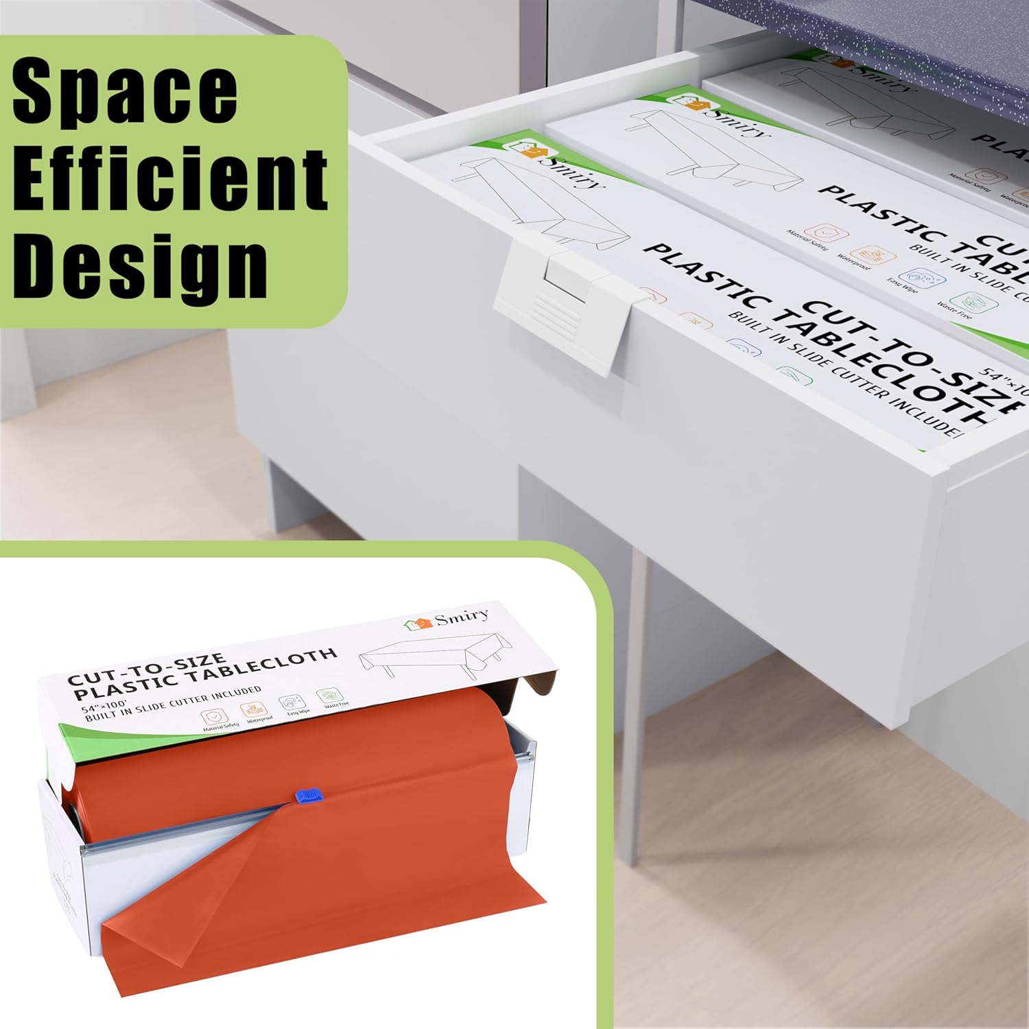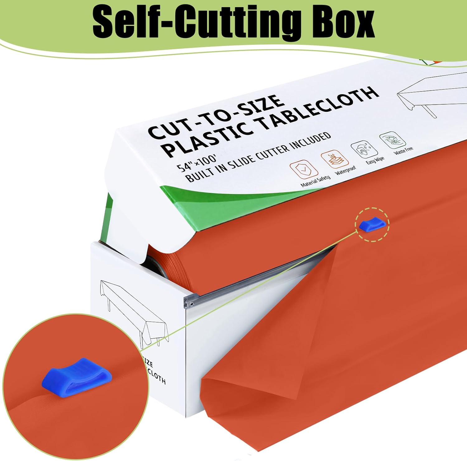 - [Easy Selection of Size with Sliding Cutter] This tablecloth roll comes in a handy box with cut-out tools that allow you to easily cut to the size you need. This plastic table cover roll is suitable match for rectangular, square, round or oval tables.