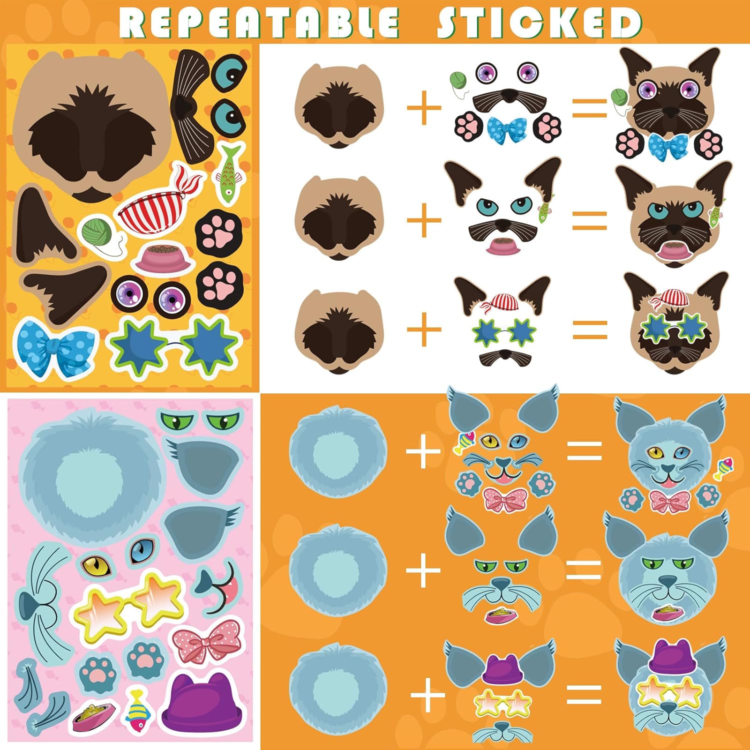 48 Sheets Cat Stickers,Make a Face Stickers for Kids, Make Your Own Cat Sticker, Animal Sticker for Kids 3-5, Brithday Gift Party Favors, Teacher Reward Classroom Games Craft