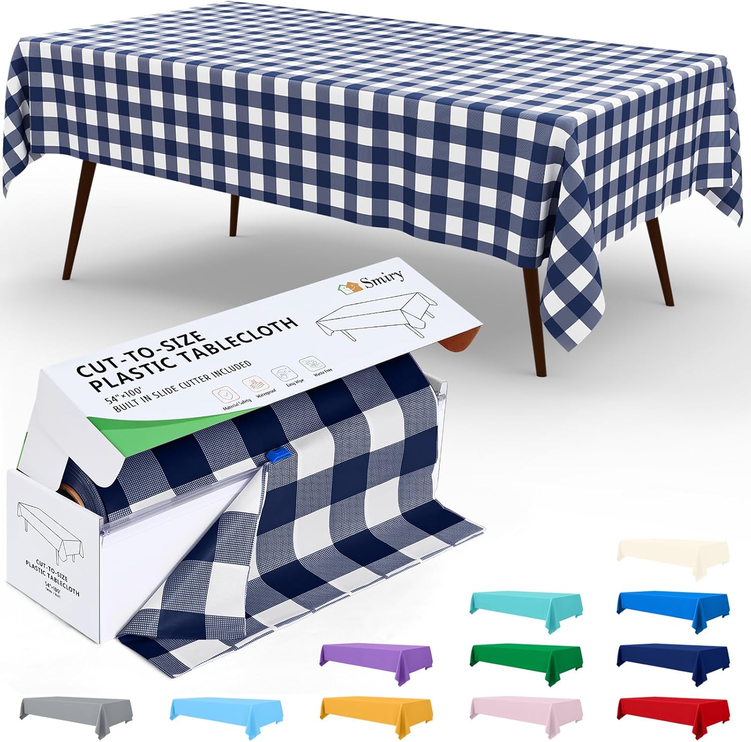 - [Easy Selection of Size with Sliding Cutter] This tablecloth roll comes in a handy box with cut-out tools that allow you to easily cut to the size you need. This plastic table cover roll is suitable match for rectangular, square, round or oval tables.