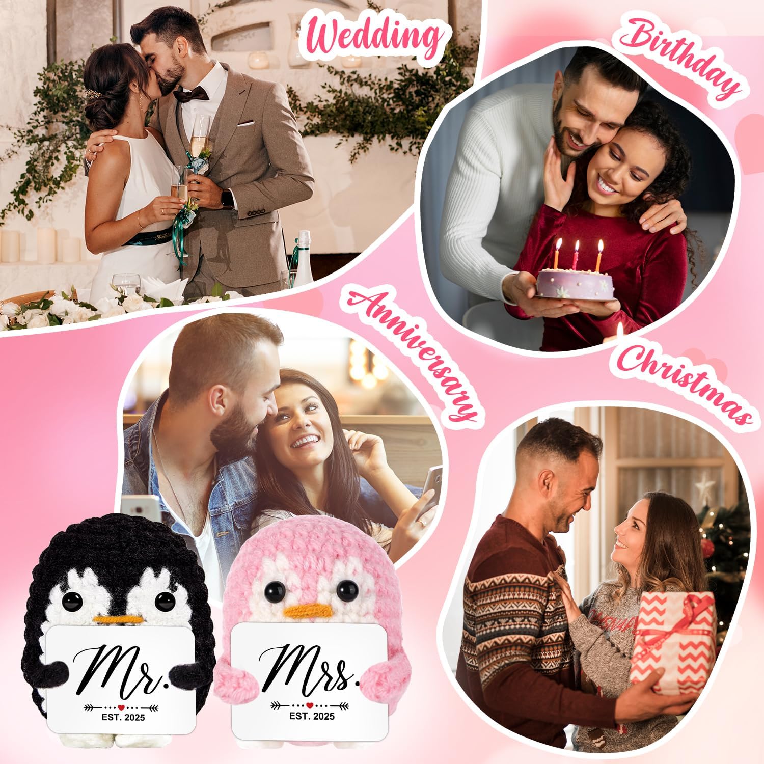 - Adorable Mr. & Mrs. Penguin Couple Design: Celebrate everlasting love with this handcrafted set of two penguin dolls, one in a soft pink tone holding a "Mrs." card and the other in classic black holding a "Mr." card. This charming pair is a symbol of togetherness and makes a heartwarming display for weddings or anniversaries.