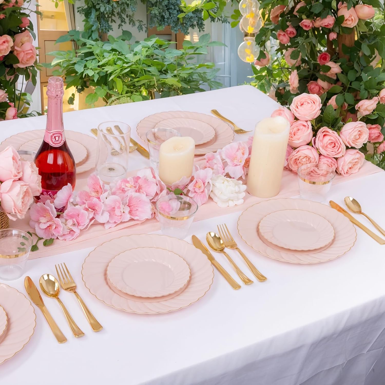 - High-End Elegant Design: These pink plastic plates with gold rim, adding a touch of luxury to your gatherings. Perfect for birthday parties, weddings, and Valentine's Day celebrations, these pink scalloped disposable plates complement any theme beautifully