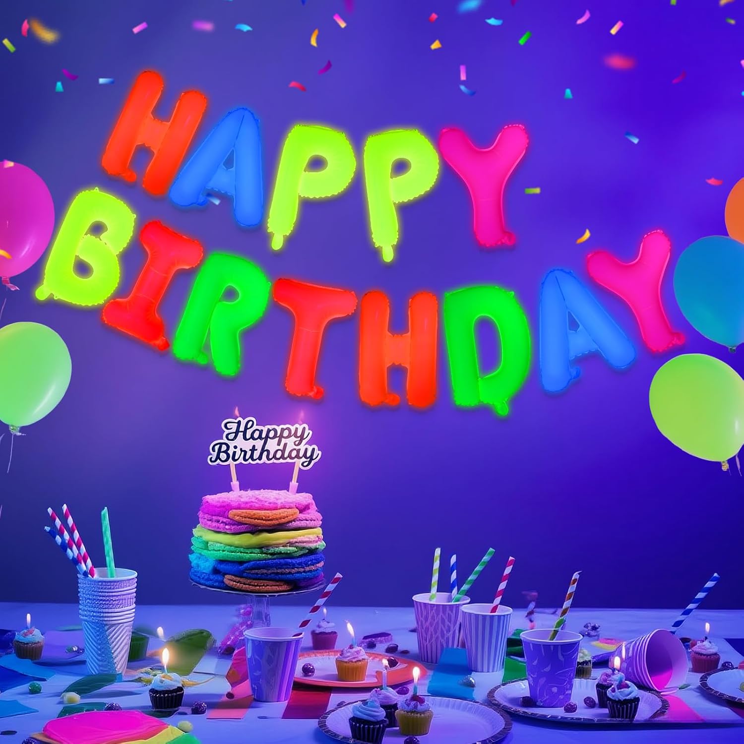 - 🎁 SUITABLE FOR THE CROWD: Suitable for decorating the babies, kids, and adults' birthday party with this lovely and creative 'HAPPY BIRTHDAY' neon balloon banner. They can also be used at parties without UV lights during the day!