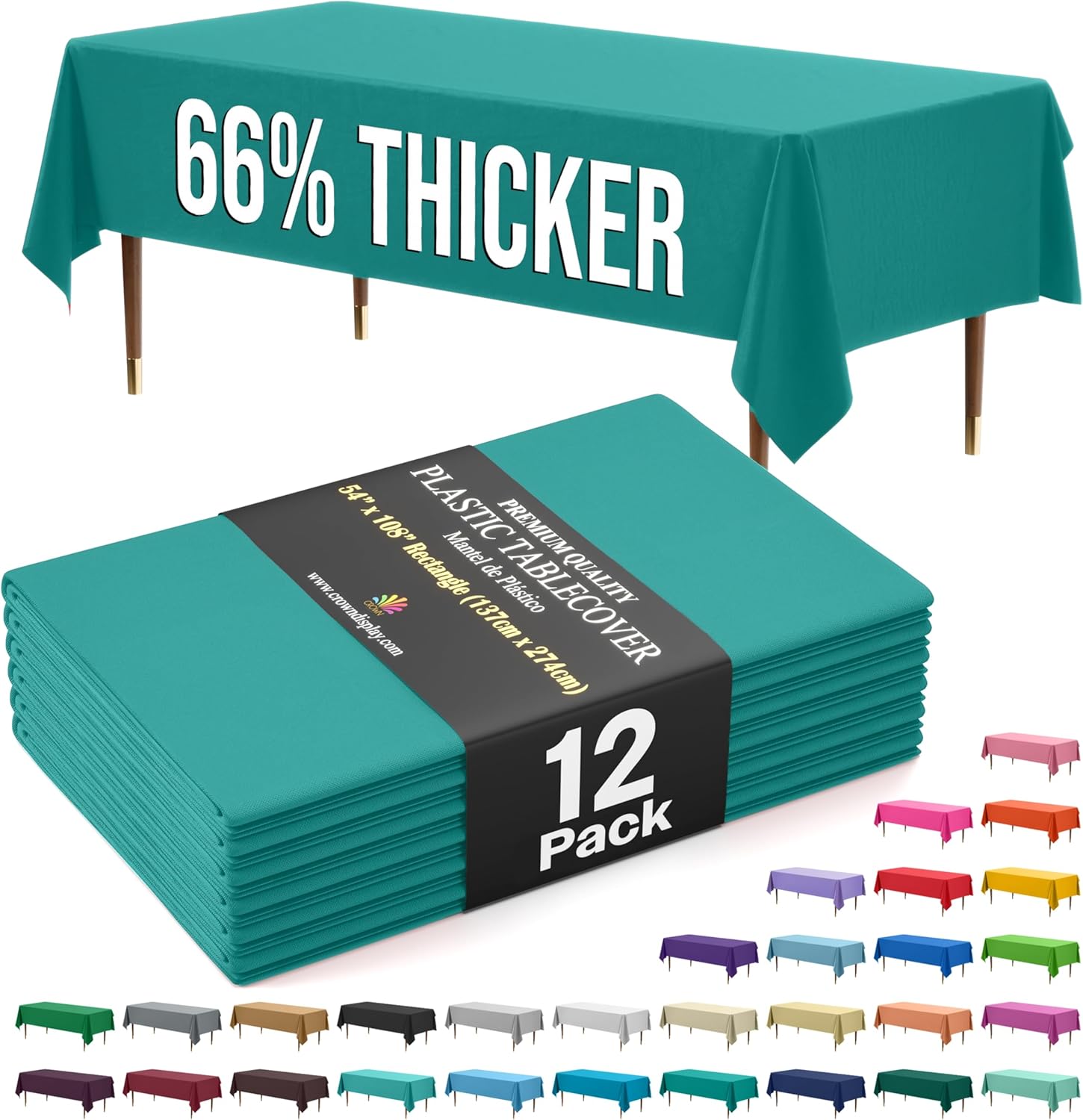 Exquisite 66% Thicker Premium Plastic Table Cloth Rectangle Table Cover 0.5 Mil 12 Pack Teal Table Cloth 54 Inch x 108 Inch Disposable Tablecloth Won't Tear Easily Like Cheap Thin Brands
