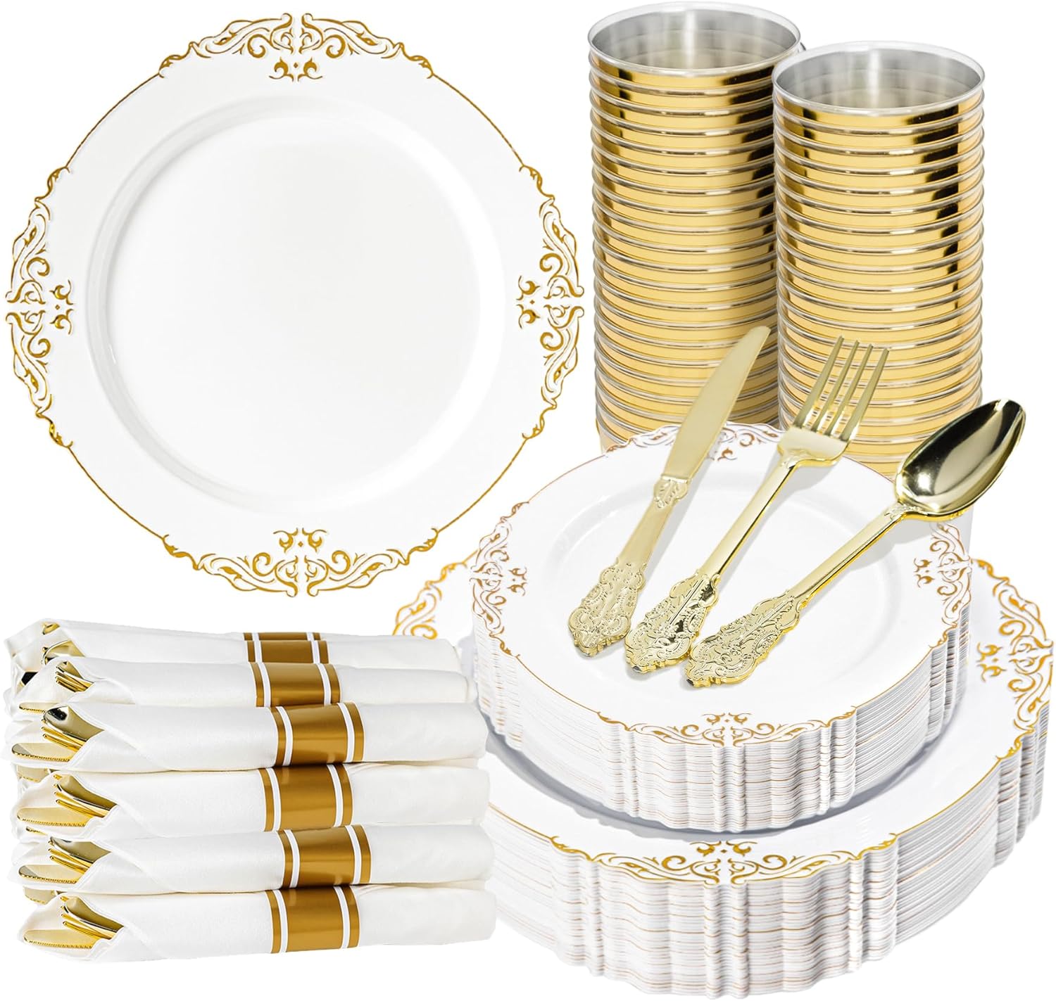 - Complete 50 Guest Plastic Dinnerware Set: A 350-piece gold plastic disposable dinnerware set includes everything for 50 guests: 10” dinner plates, 7” dessert plates, utensils, napkins, and gold-rimmed cups. Ideal for wedding plastic dinnerware sets or large parties—unbox and serve instantl
