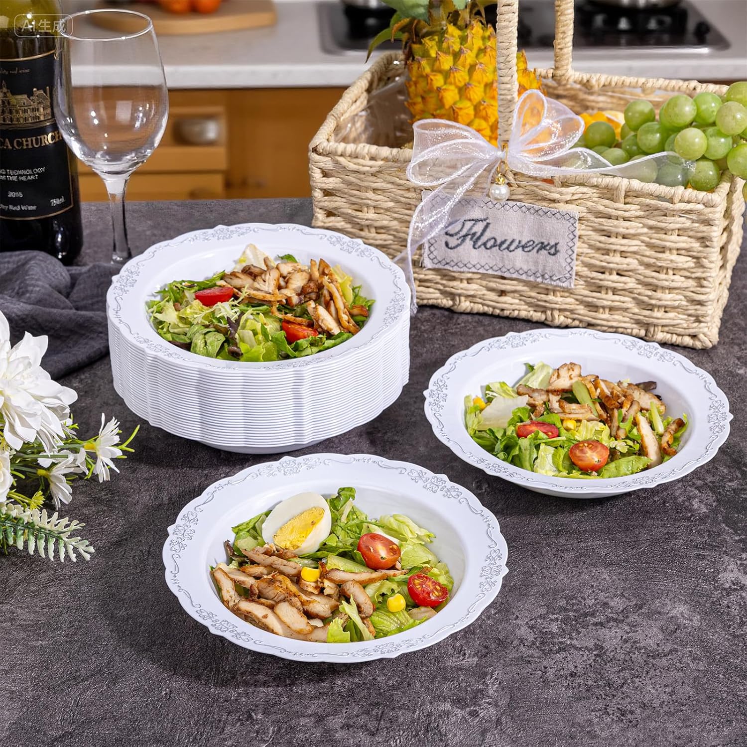 DaYammi 50 Pack Plastic Bowls with Silver Rim, 12oz Disposable Soup Bowls, Heavy Duty Dinner Bowls for Weddings, Parties, Dinners, Catering and Everyday Use