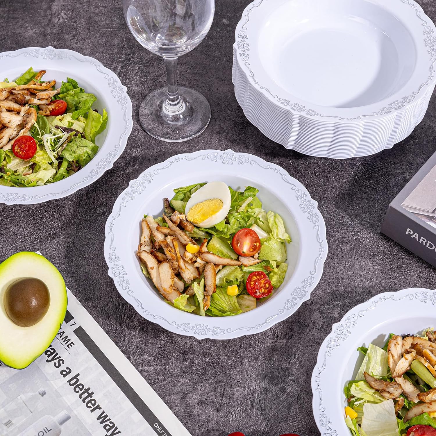- STURDY & DURABLE - These disposable plastic bowls are crafted from heavy-duty plastic, ensuring resistance to bending and breaking. The silver-accented bowls maintain their shape and integrity even when holding hot soups, cold dishes, or heavier foods. Additionally, you can wash and store these soup bowls in a dry place for future reuse.