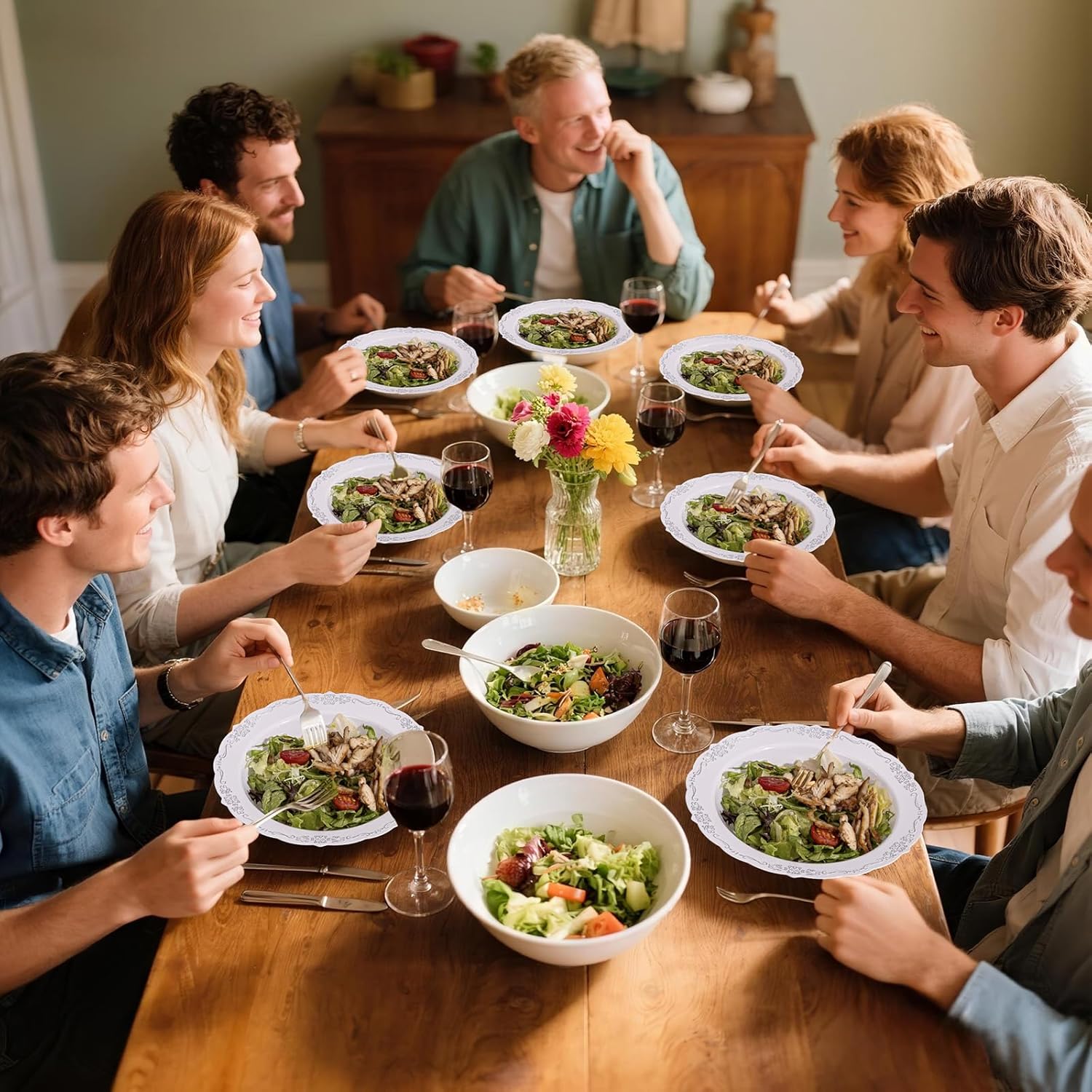 - ELEGANT APPEARANCE - Featuring a glossy finish with white bodies and silver rims, these plastic bowls complement silver silverware beautifully. Each small bowl is designed with a wide rim for easy handling while minimizing the risk of burns. Whether at an extravagant event or an intimate family dinner setting, they add sophistication and refinement to any table.