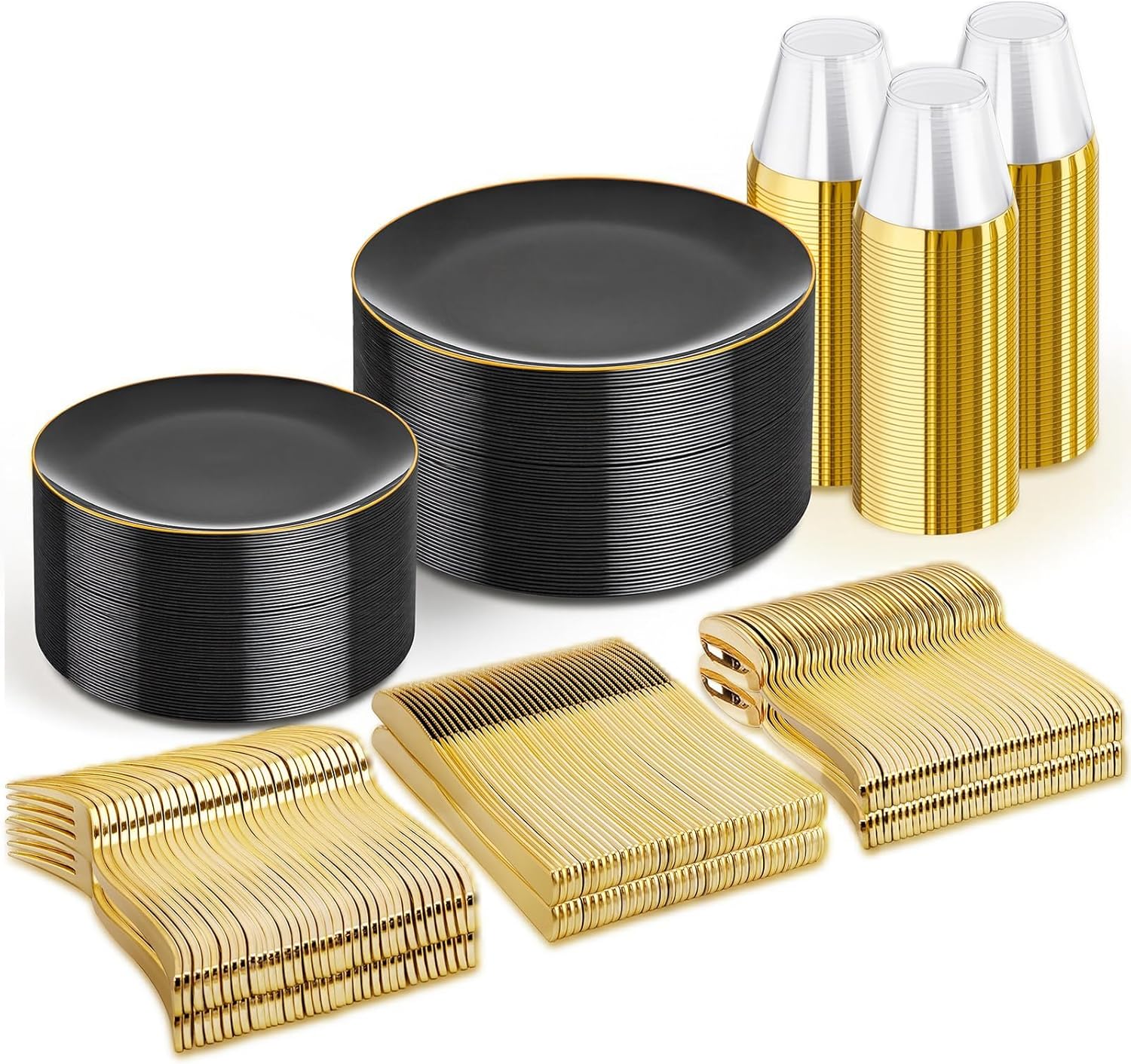 - PERFECT FOR ANY OCCASION: Whether it's wedding, birthday party, Halloween, new year, business activity, back to school, or any other special occasion, our black gold plates with gold rim can add a touch of elegance to any event. Our black disposable plates will complete your party!